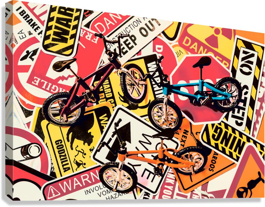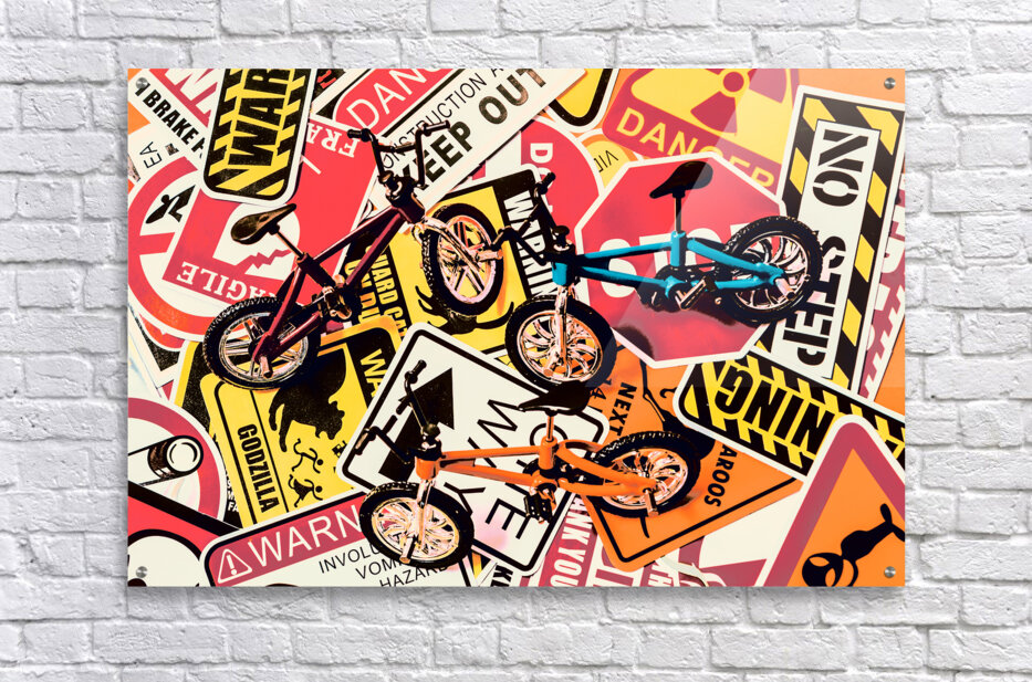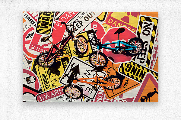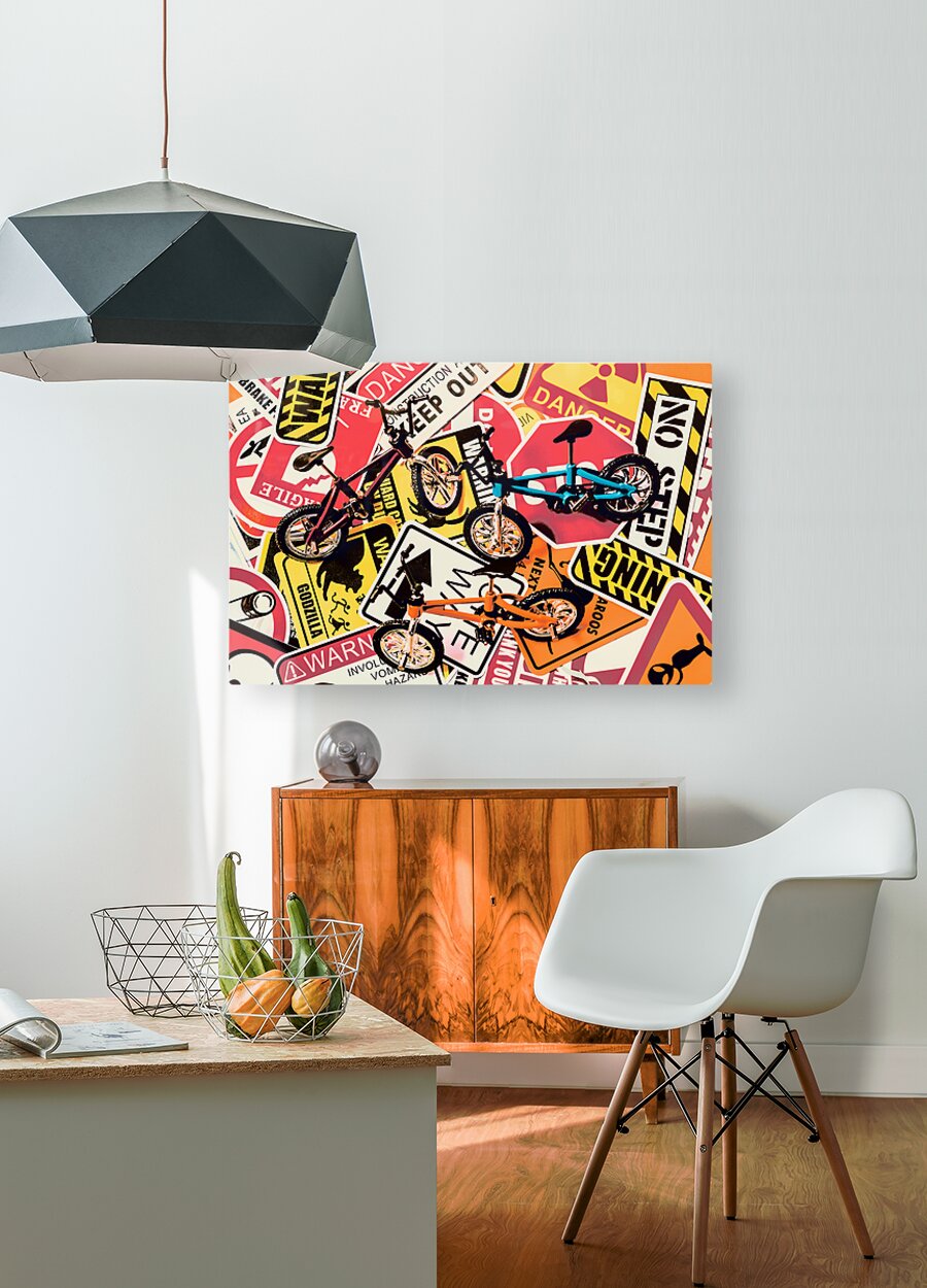 Street scene still life art of urban traffic signs and road bikes. City cycle avenue