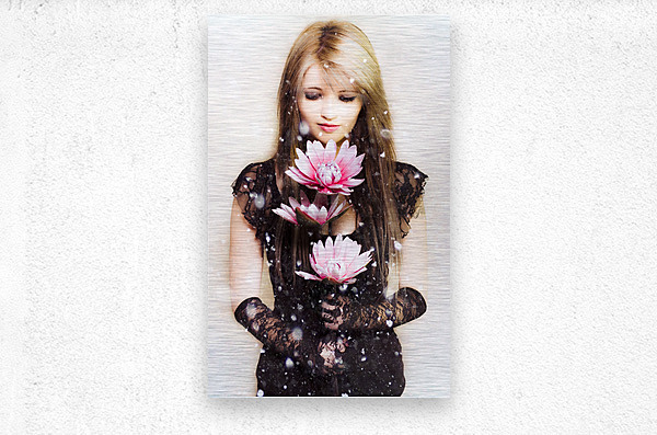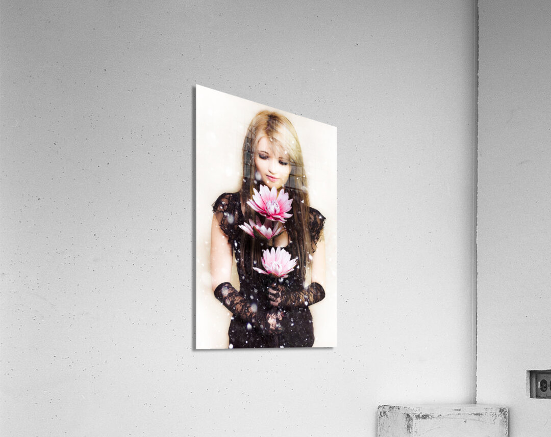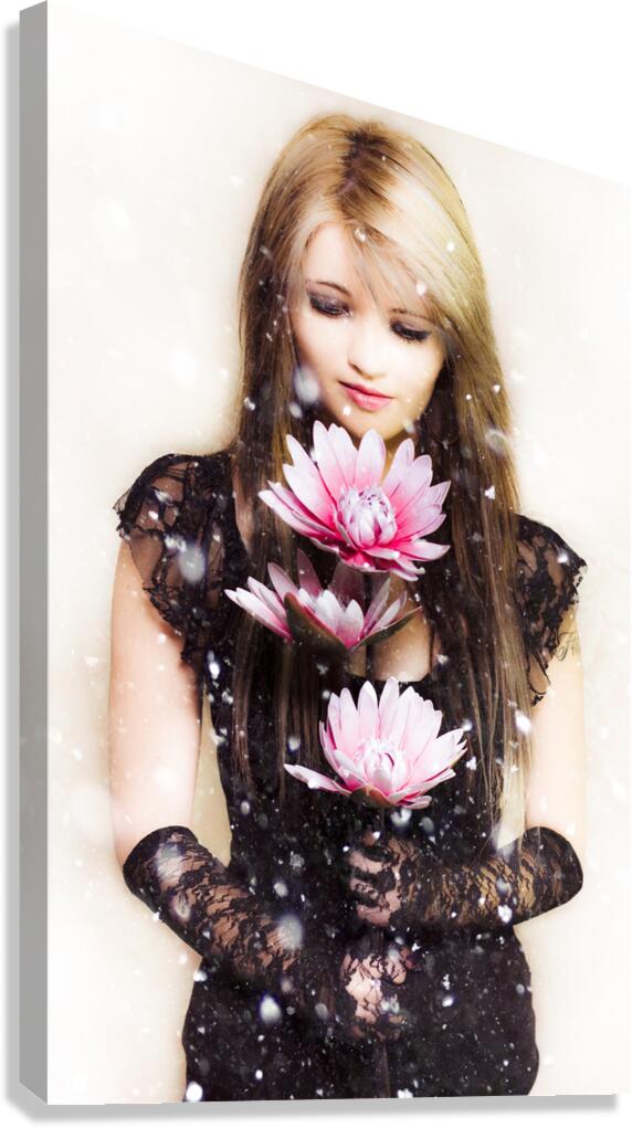 Get this artwork "Beautiful young woman holding a delicate flower" in a framed print.