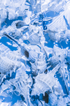 Underwater scene on bottom dwelling sea shells and luminescent light rays. Deep blue