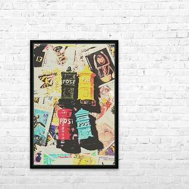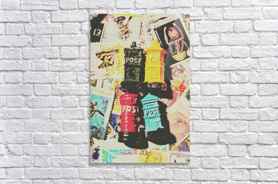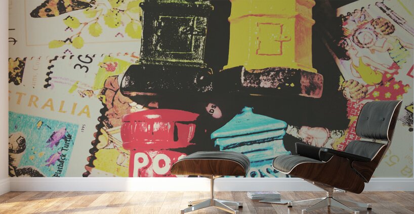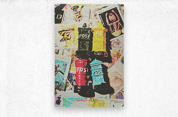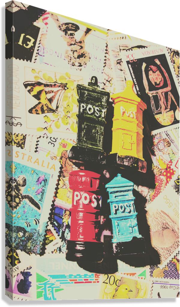 Retro fine art scene on four mailboxes placed on nostalgic postage stamp stationary. Pop art in post