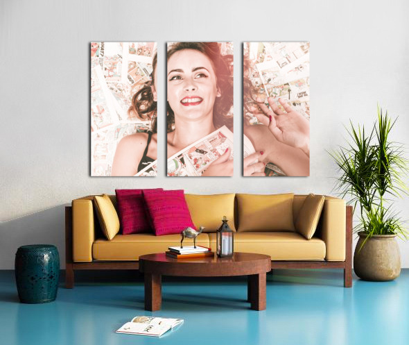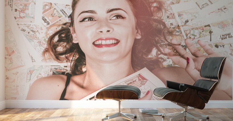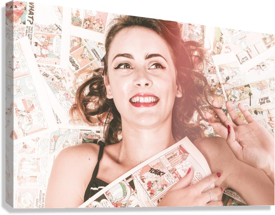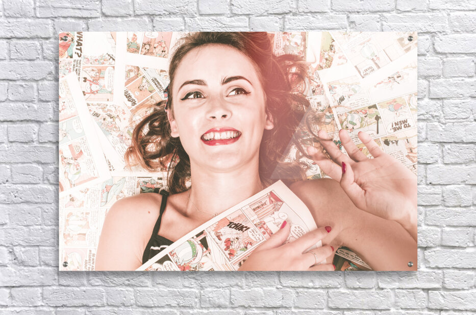 Avant-garde photograph with red tone fade of a vintage pretty pinup woman with red lips and curly hairstyle hugging pages from her prized comic book collection. Cartoon character love