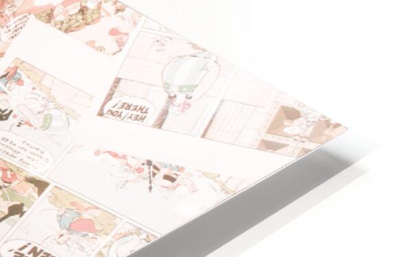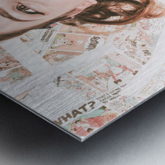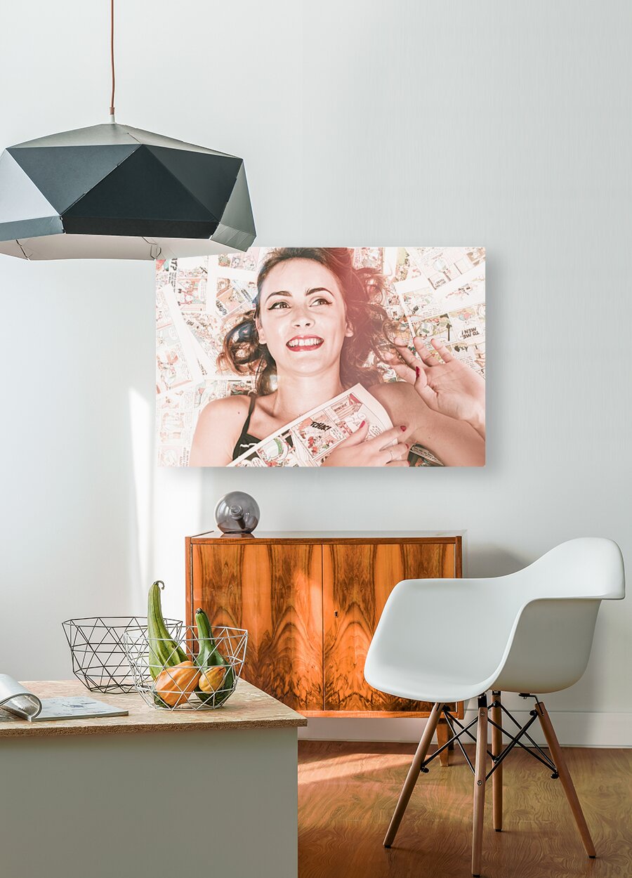 Avant-garde photograph with red tone fade of a vintage pretty pinup woman with red lips and curly hairstyle hugging pages from her prized comic book c...[+]