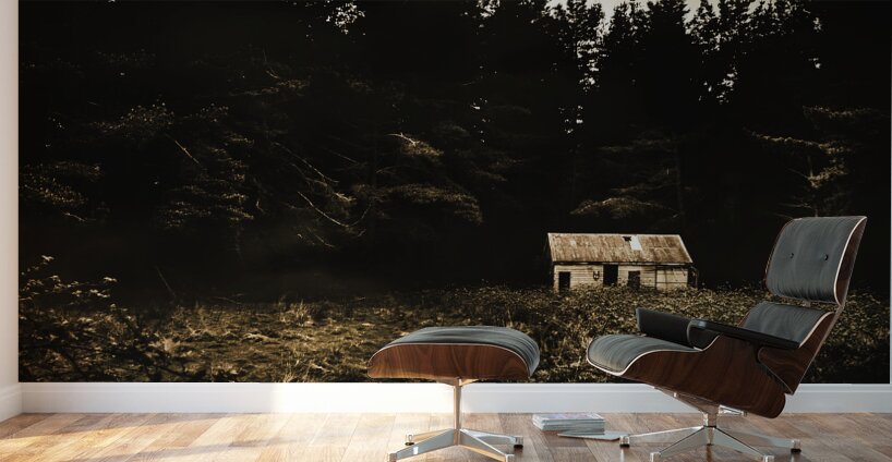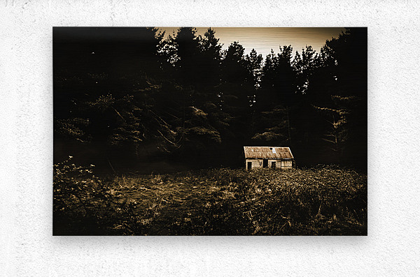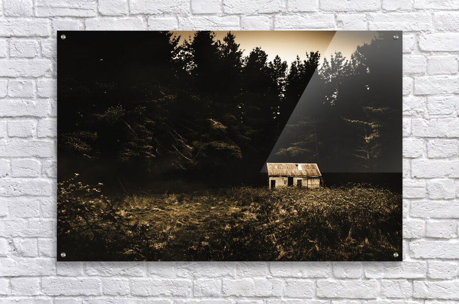 Old-fashioned outback Australia scene on a typical old abandoned barn in a dark forest clearing. Fitzgerald Tasmania Australia