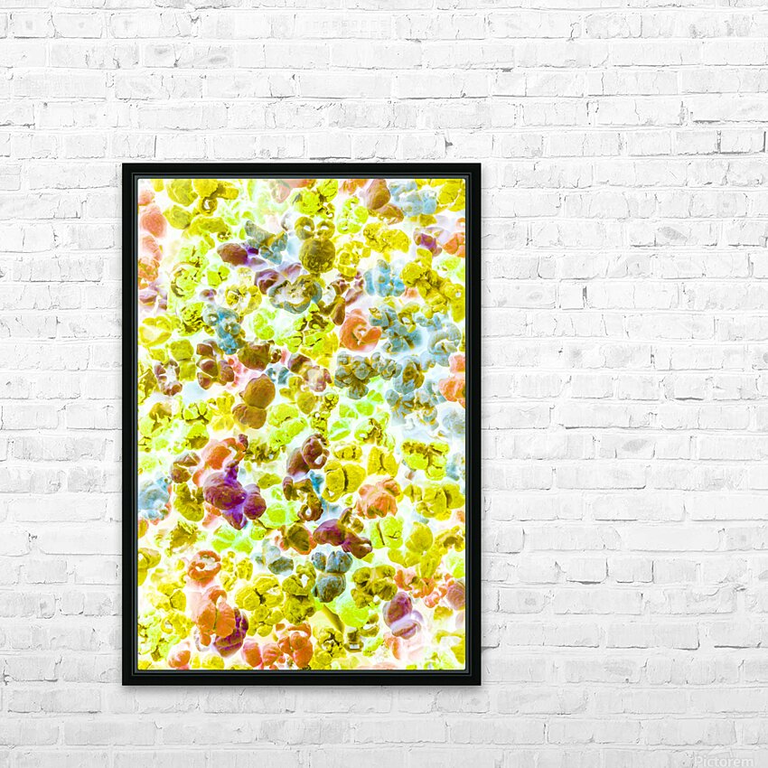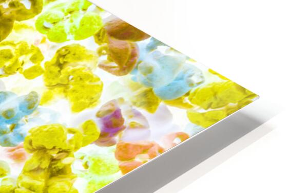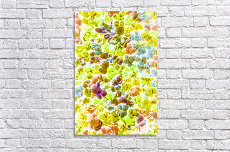 Abstract food art on a colourful array of popcorn candies in sweet theatrical composition. Movie munchies