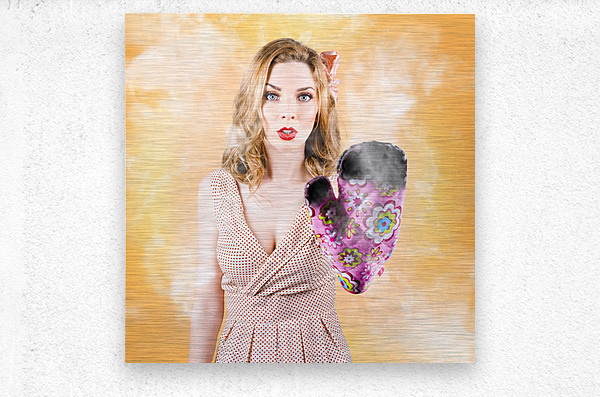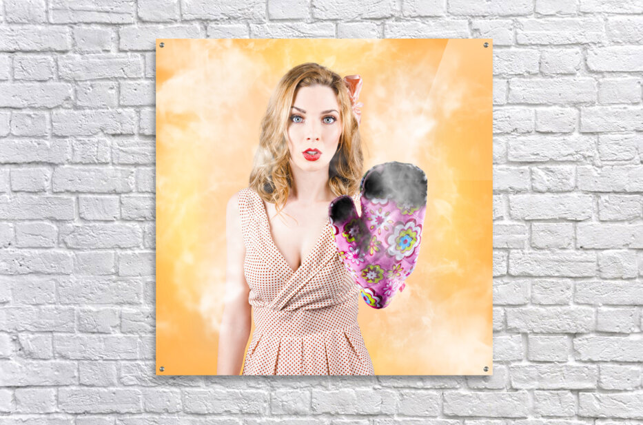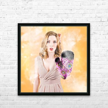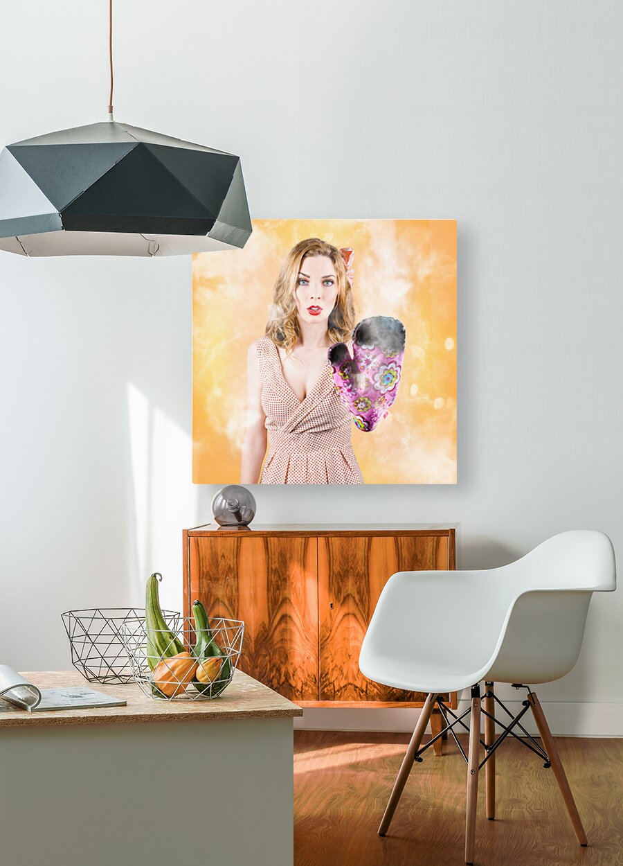 Funny woman cook waving stop. Bad cooking Picture Frame Printing