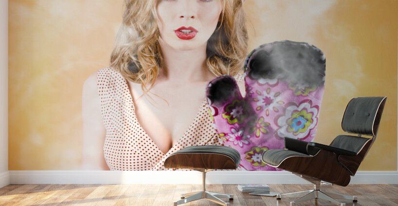 Funny woman cook gesturing stop inside a kitchen while wearing a burnt cooking mitt. Bad cooking