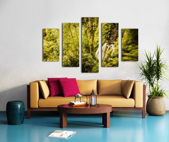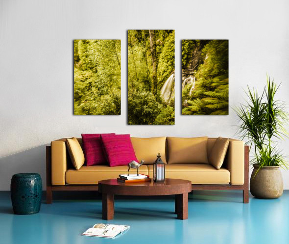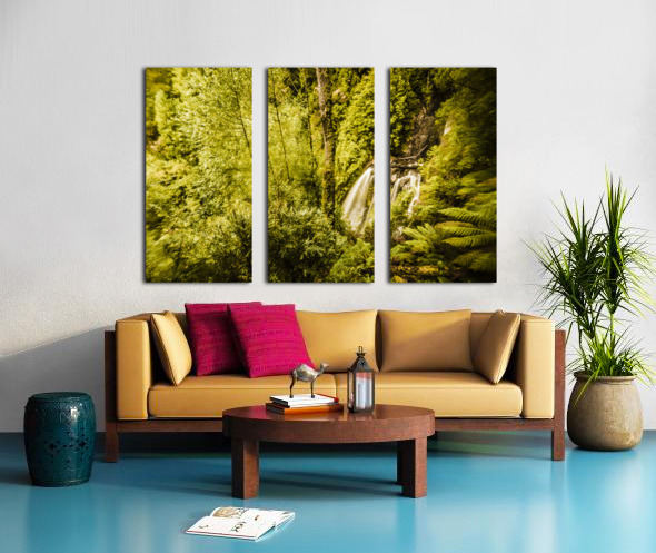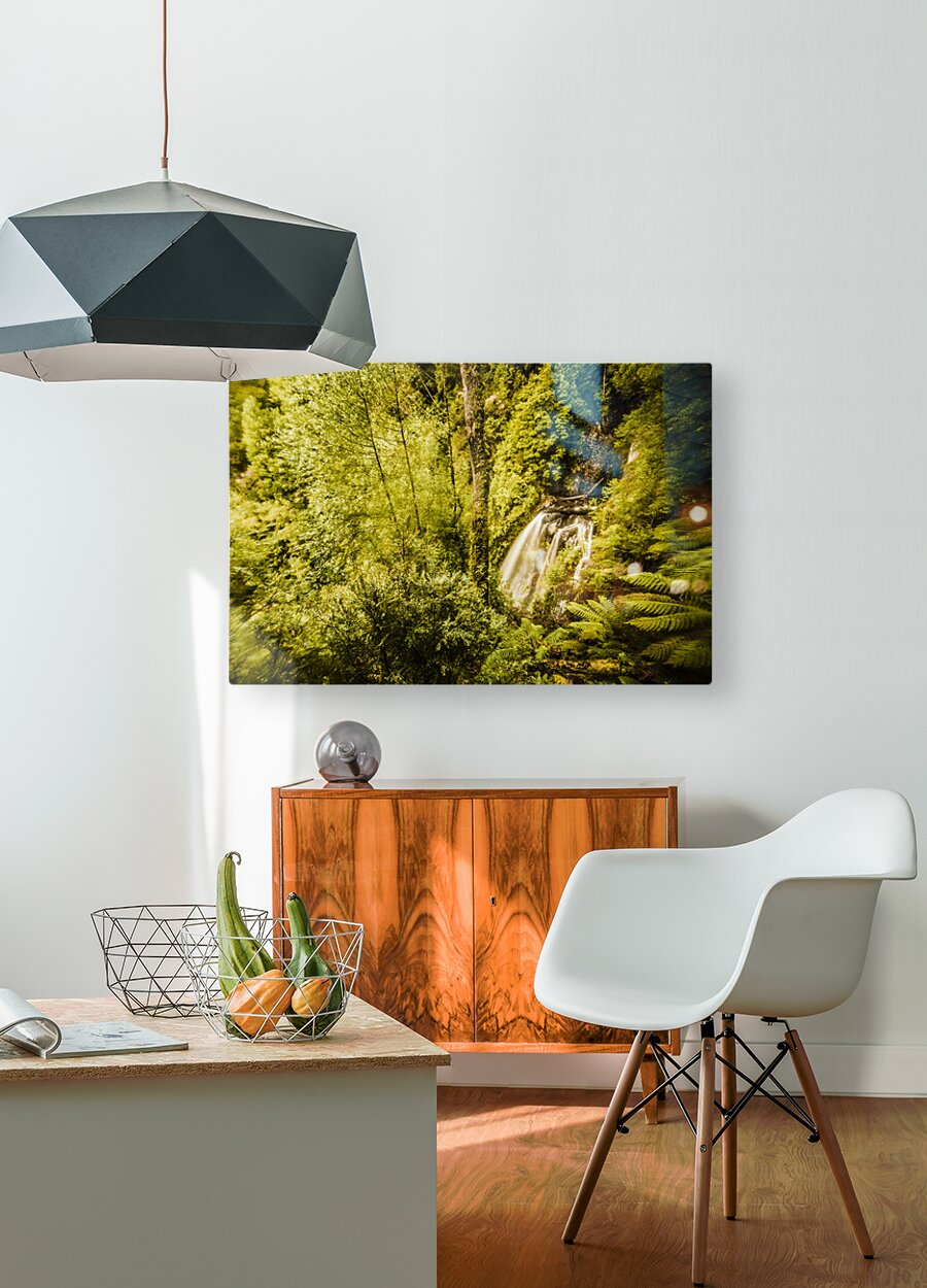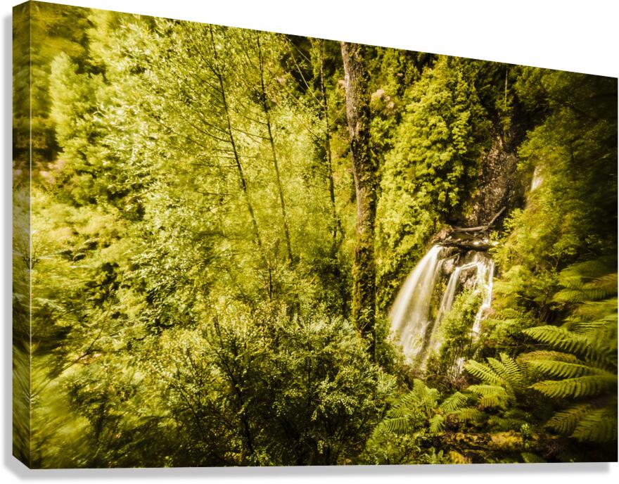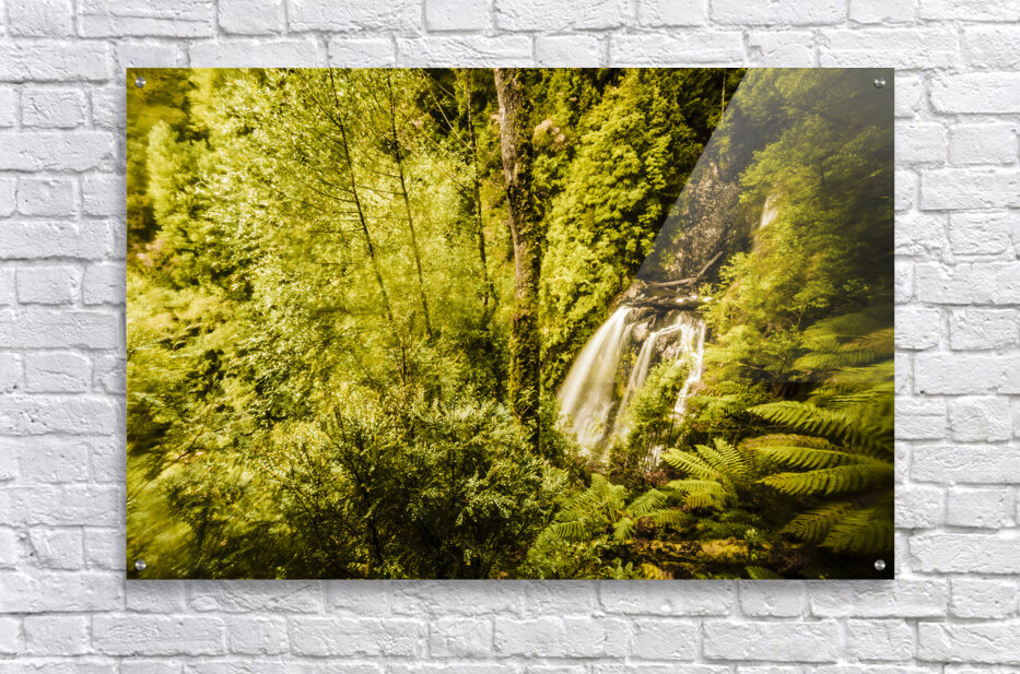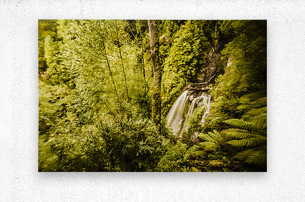 Overhead view on a temperate fern forest with cascading waterfall. Philosopher Falls West Tasmania Australia