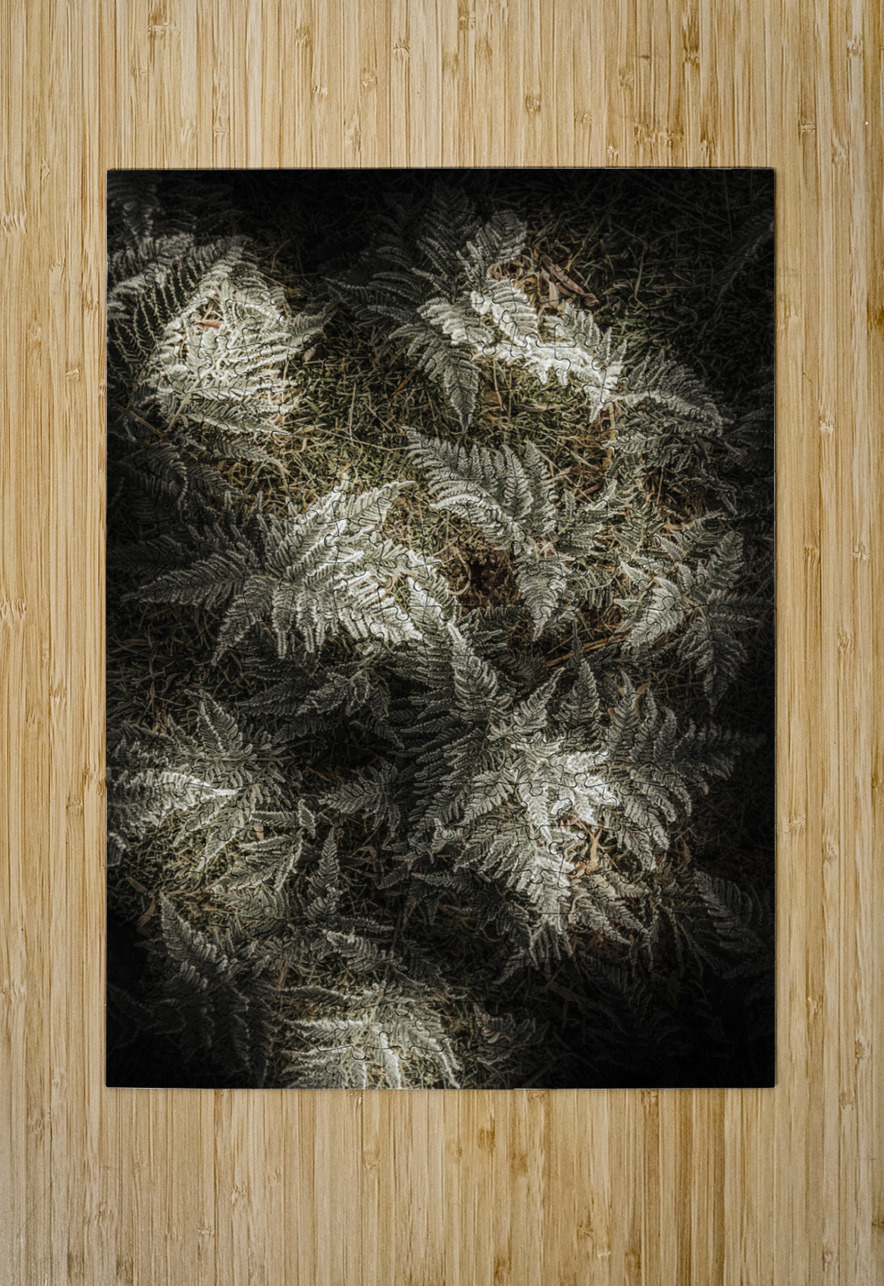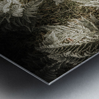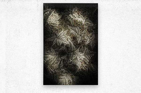 Cold white ice crystals on frozen winter plants in the dark of night. Frost ferns