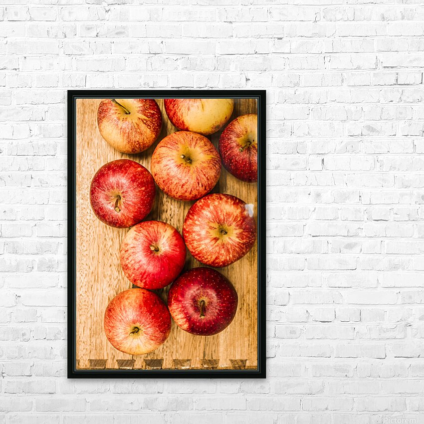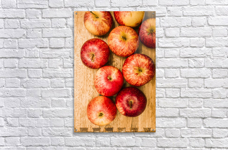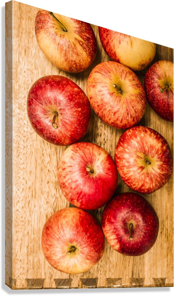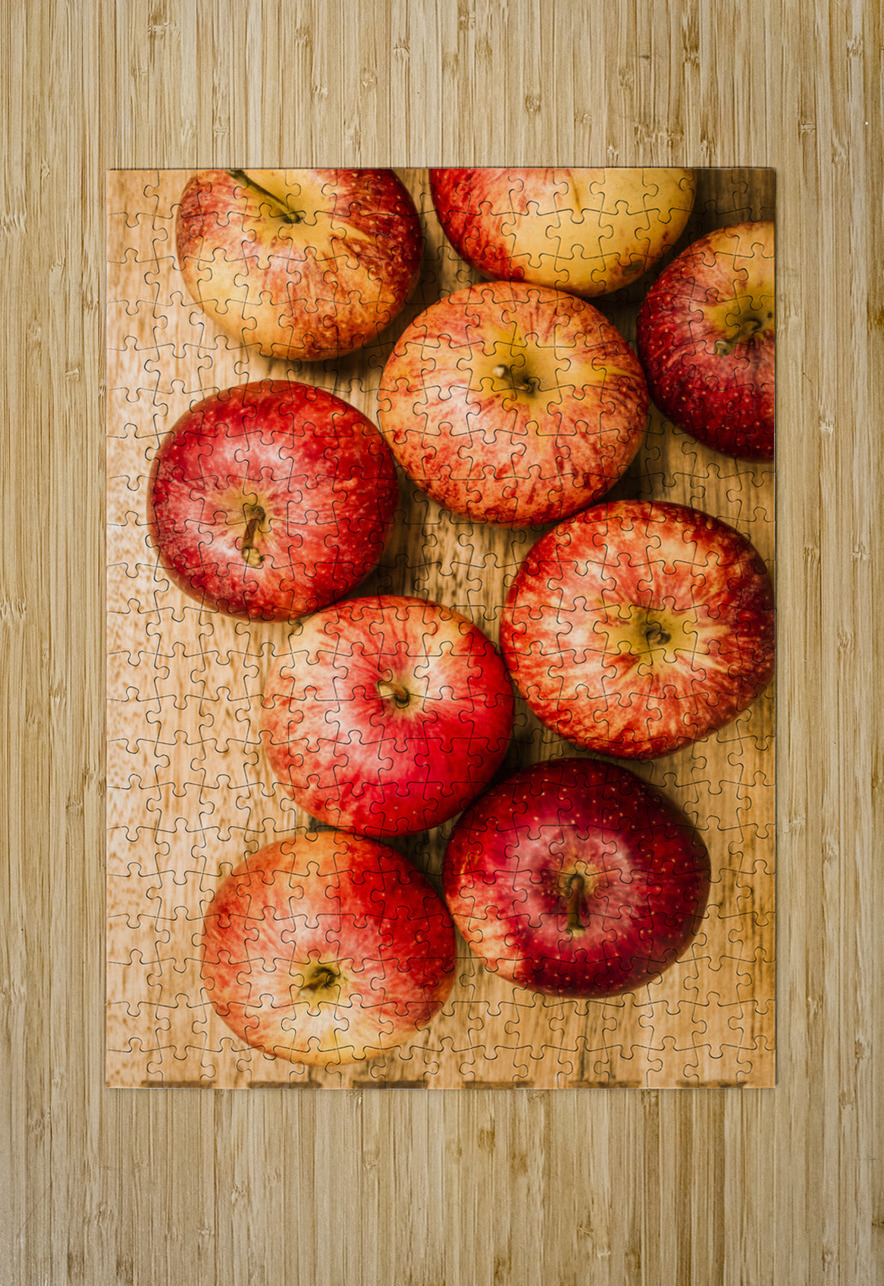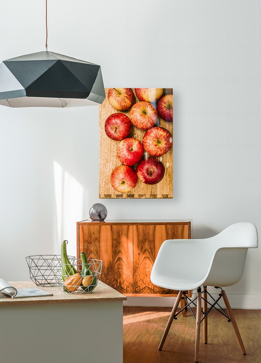 Still life kitchen artwork on ripe red apples on wooden table. Decor details
