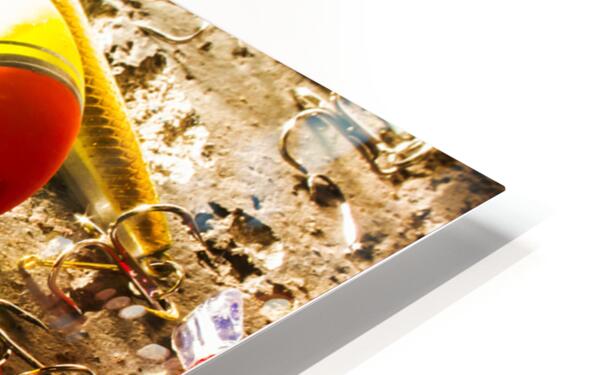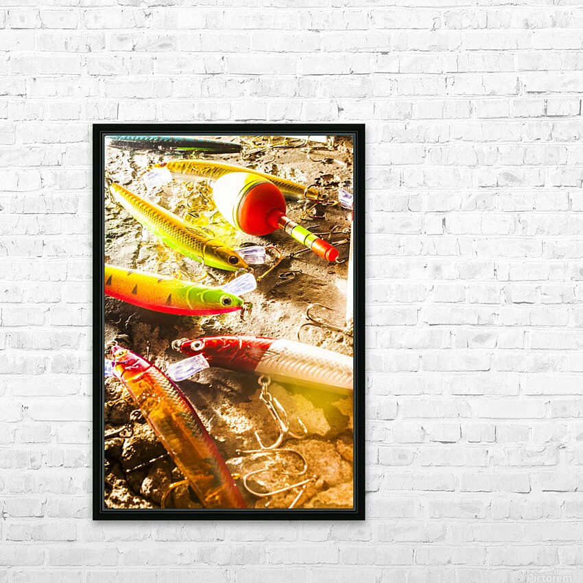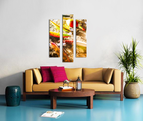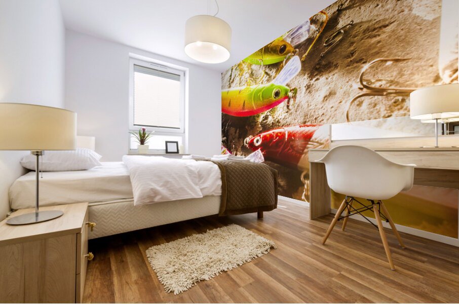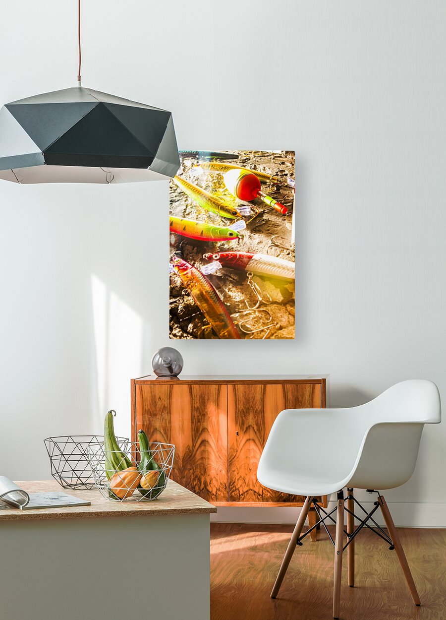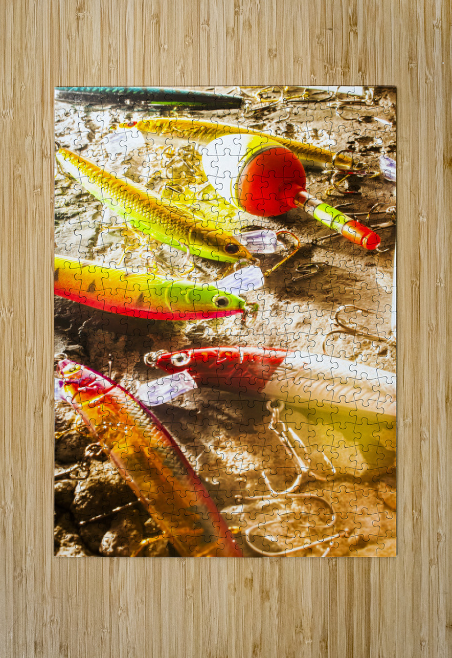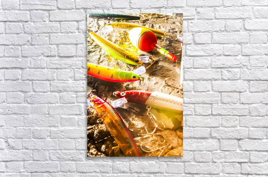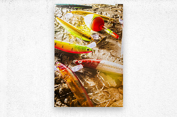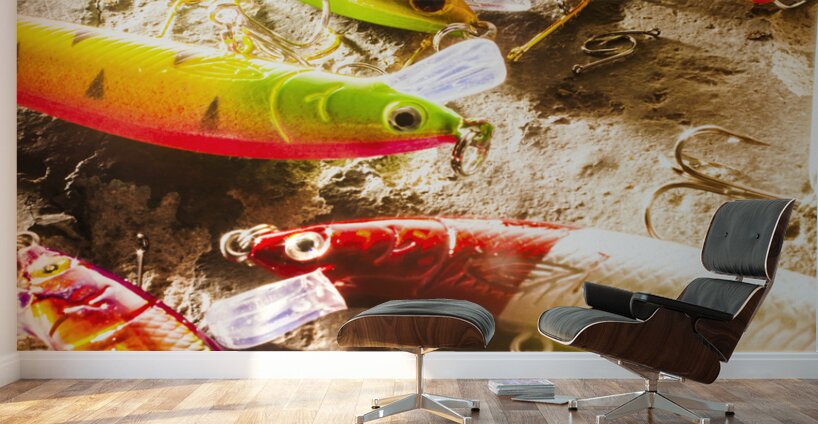 Colourful flared marine art on a haze of fish lures and hooks on rough backdrop. Fisheries and tackle