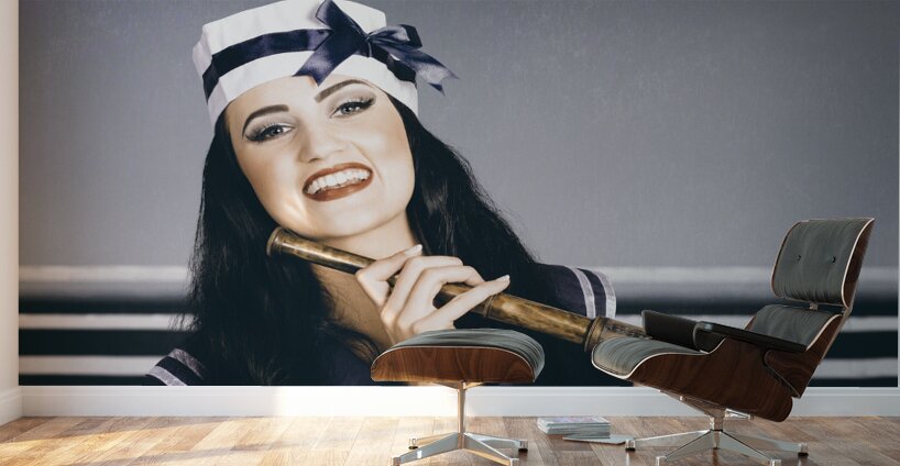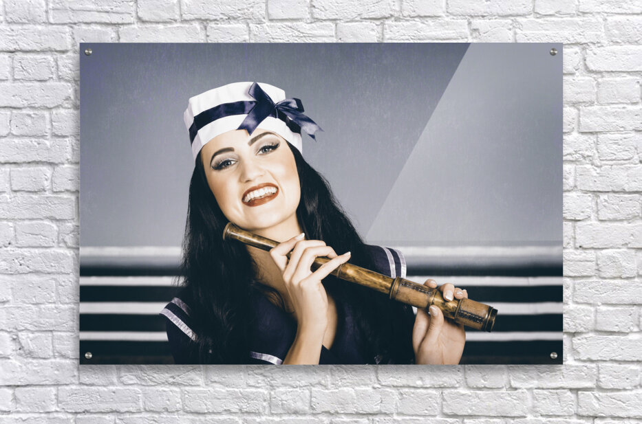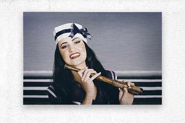 Desaturated portrait with vintage texture of beautiful young sailor girl with stylish make-up and brunette hair looking out to sea with nautical telescope. Navy border patrol