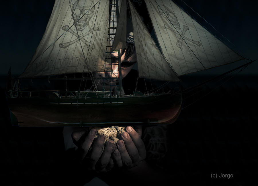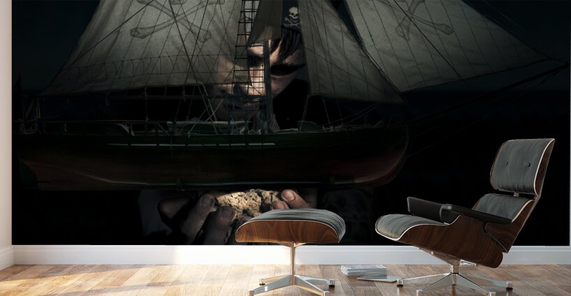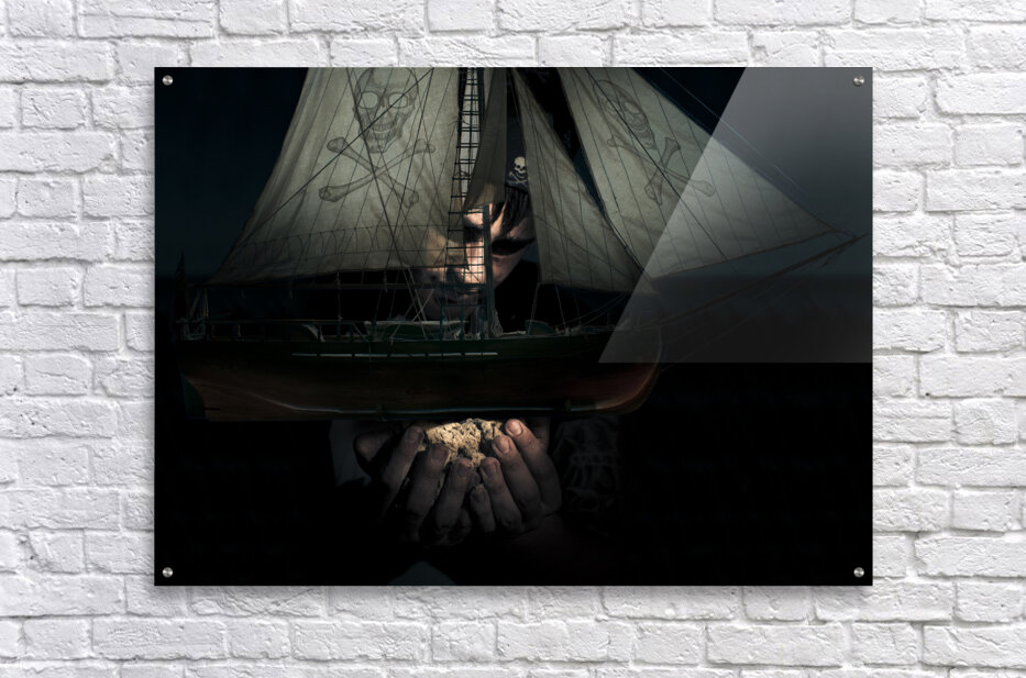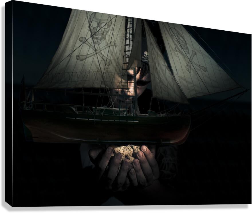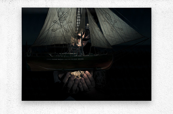 Dark Supernatural And Mysterious Adventure Concept With A Giant Pirate Holding A Captured Pirate Ship Symbolizing A Quest Of Voyage And Exploration