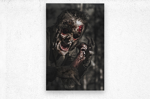 Spooky horror photograph of an evil male zombie with rotten face shouting out in bloody terror at dark haunted forest. The bone collector