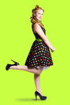 Side view of happy young woman in retro spotted dress white background