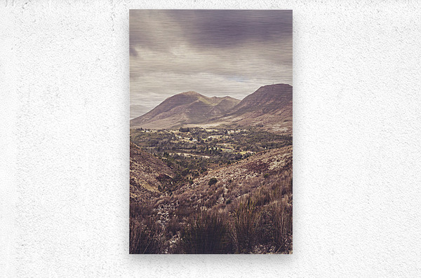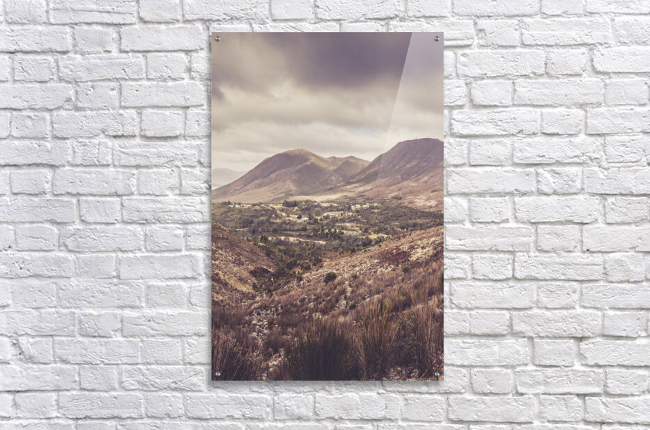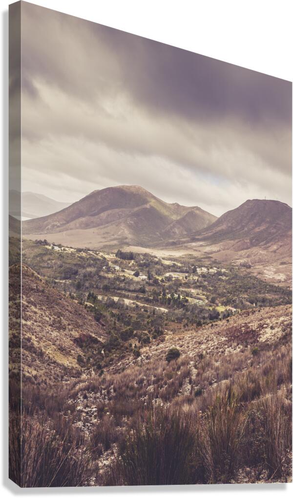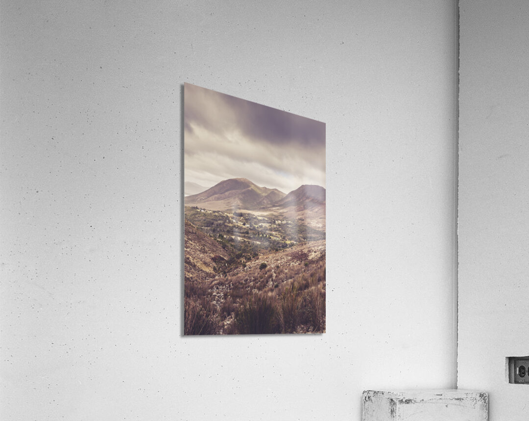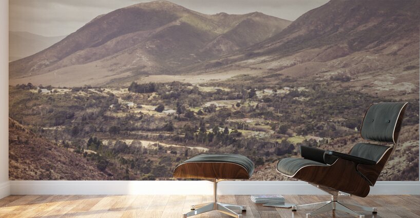 Serene scene of muted countryside harmony with valley towns and mountain clouds. Gormanston Western Tasmania Australia