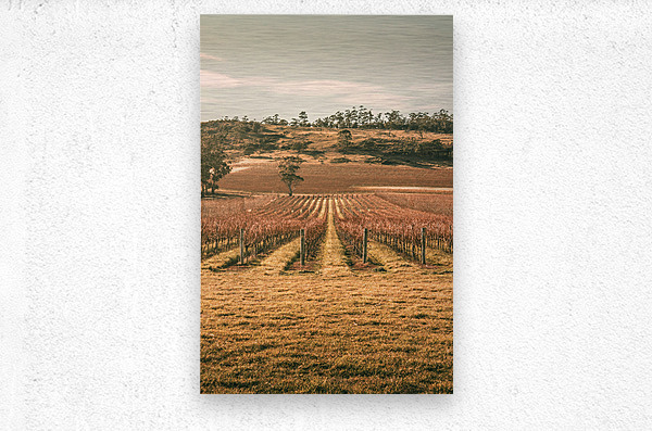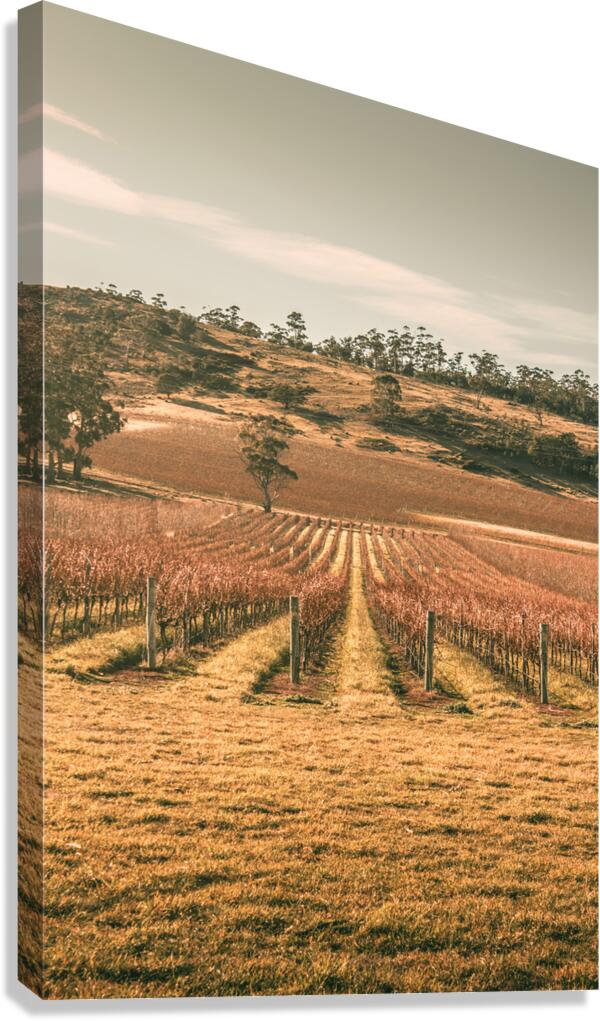 Classic winter style photograph on the lines of grapevines during the winter season. Cranbrook vineyard Tasmania Australia