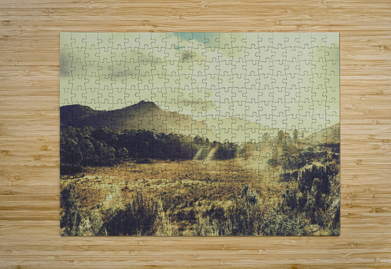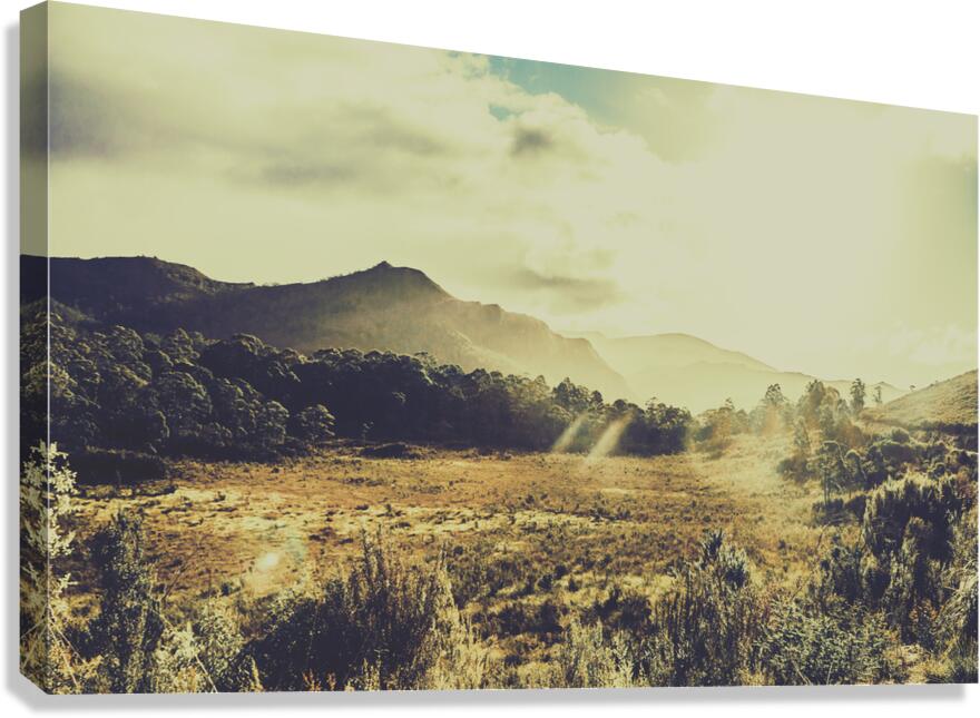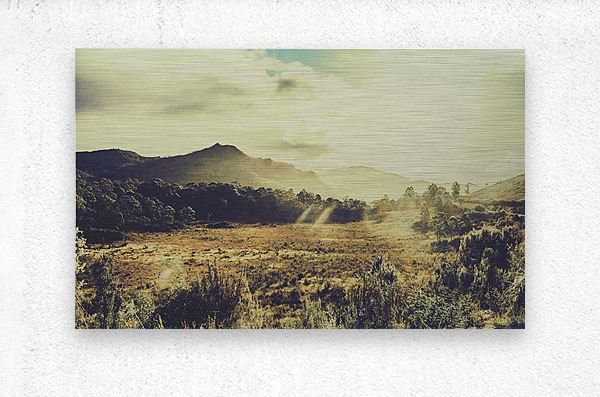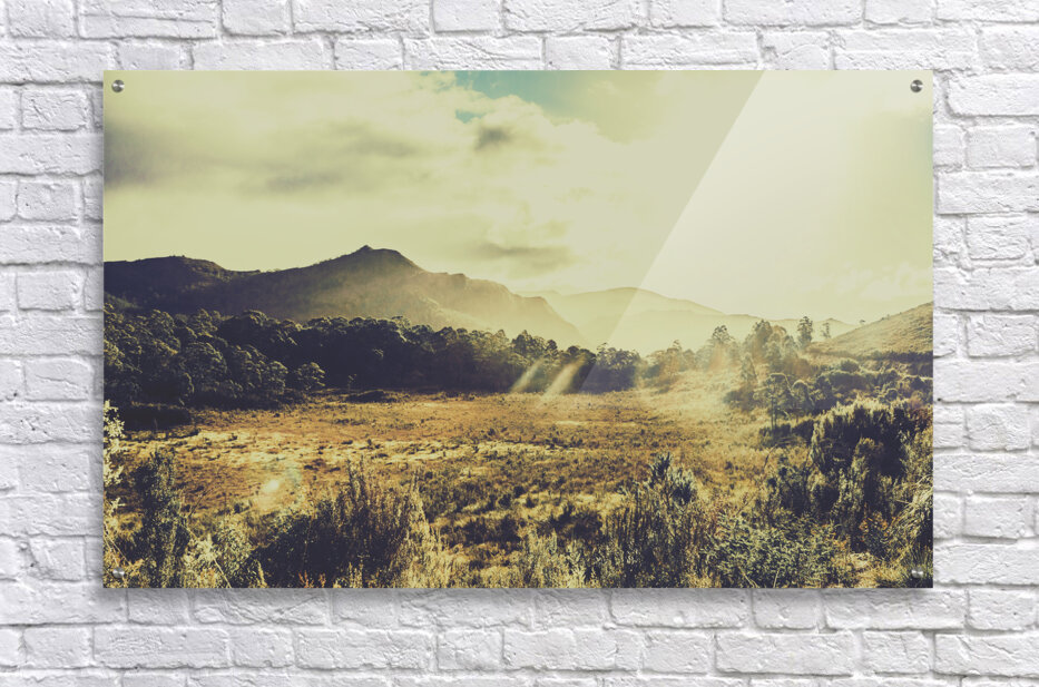 Typical Australian outback scene on a view of glowing country meadows and mountains. Derwent Bridge Tasmania Australia