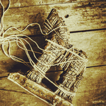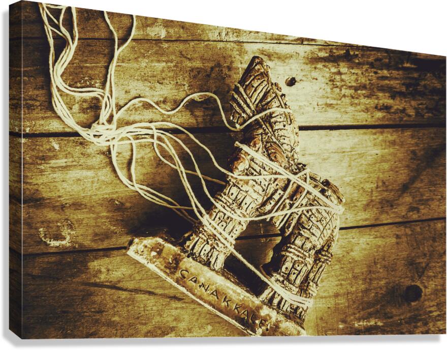 Handcrafted wooden horse toy being pulled by ropes close-up rustic wooden background trojan horse concept