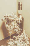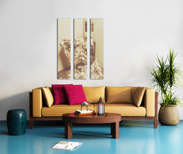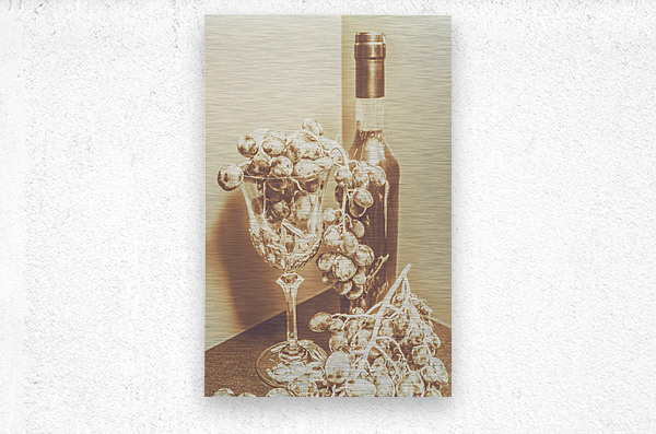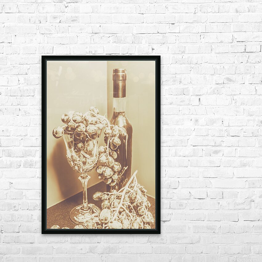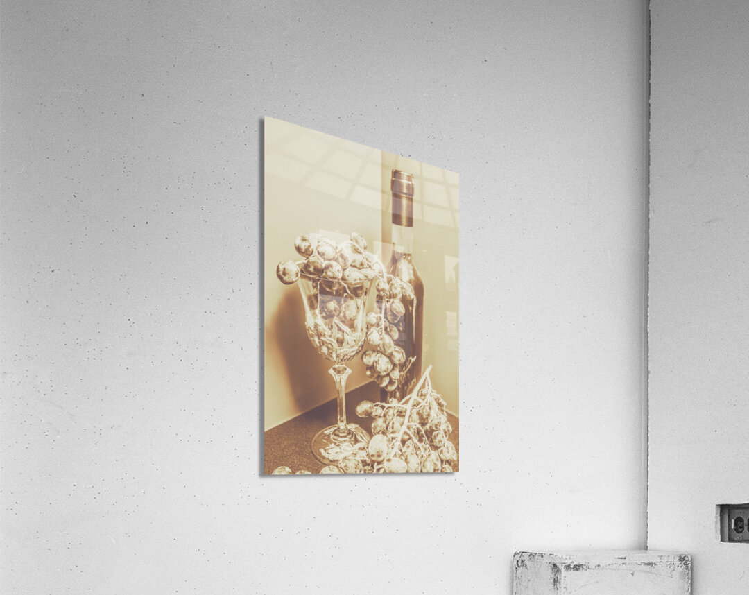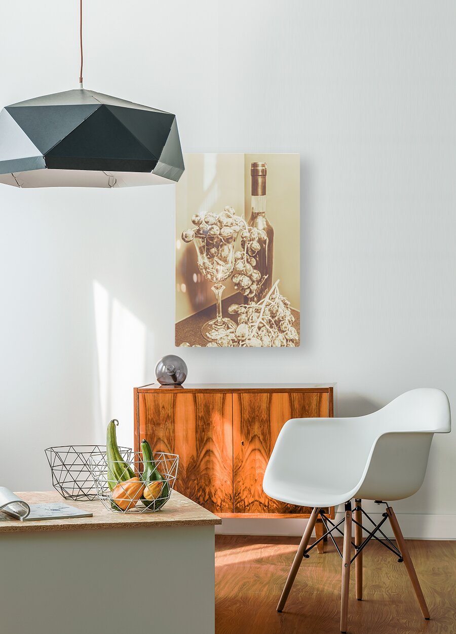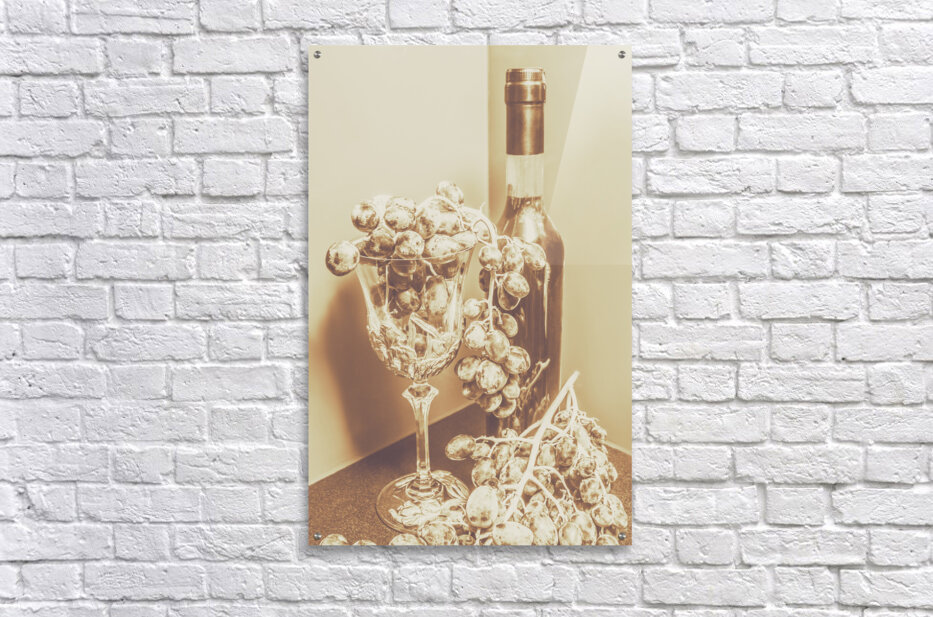 Old-fashioned bar artwork on a posed display of wino decor with grapes and crystal decanter. The vine cellar
