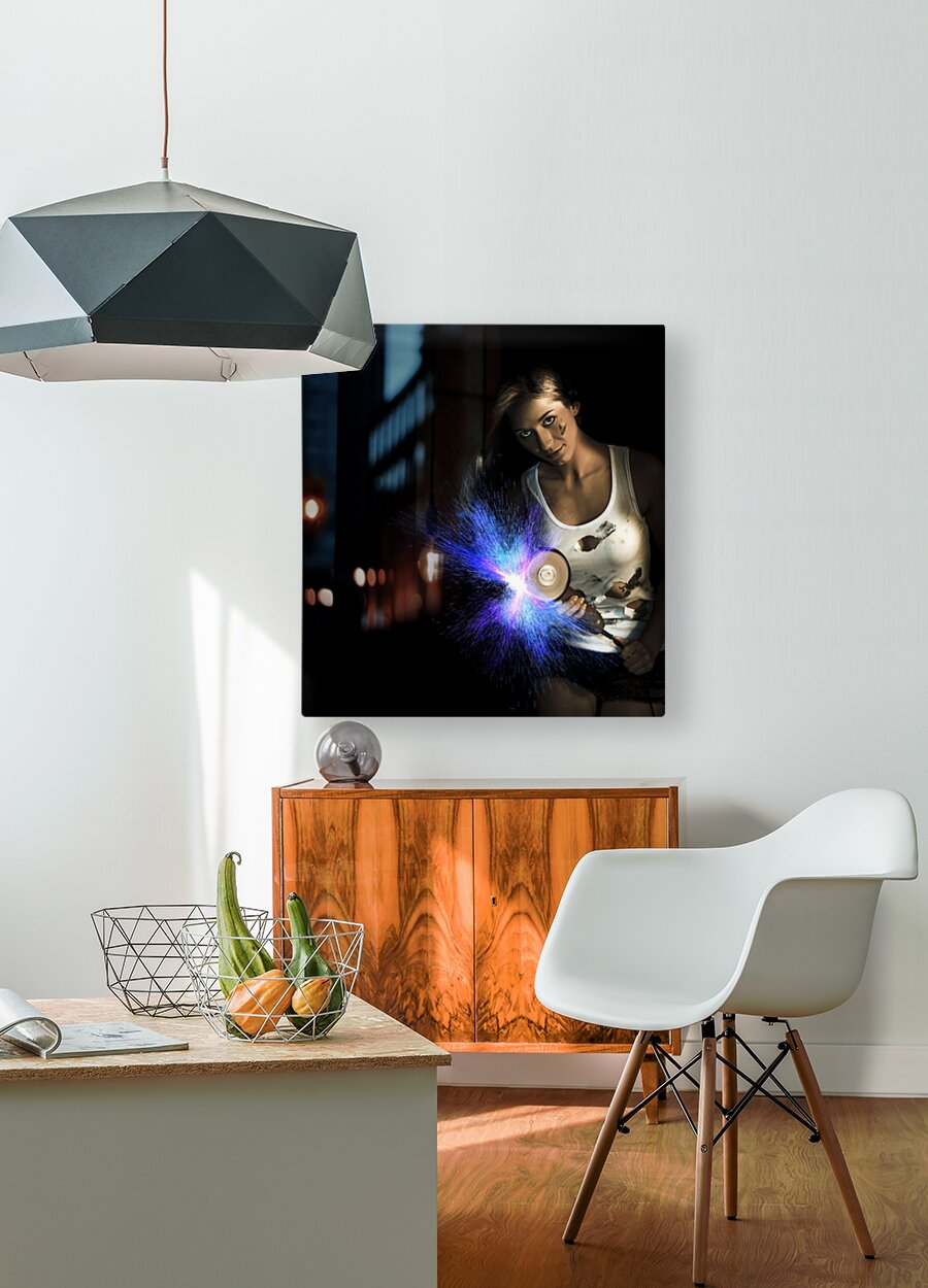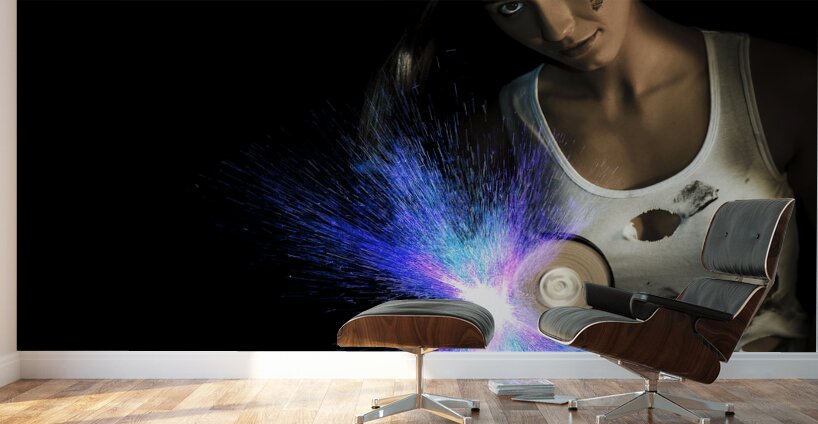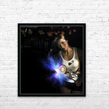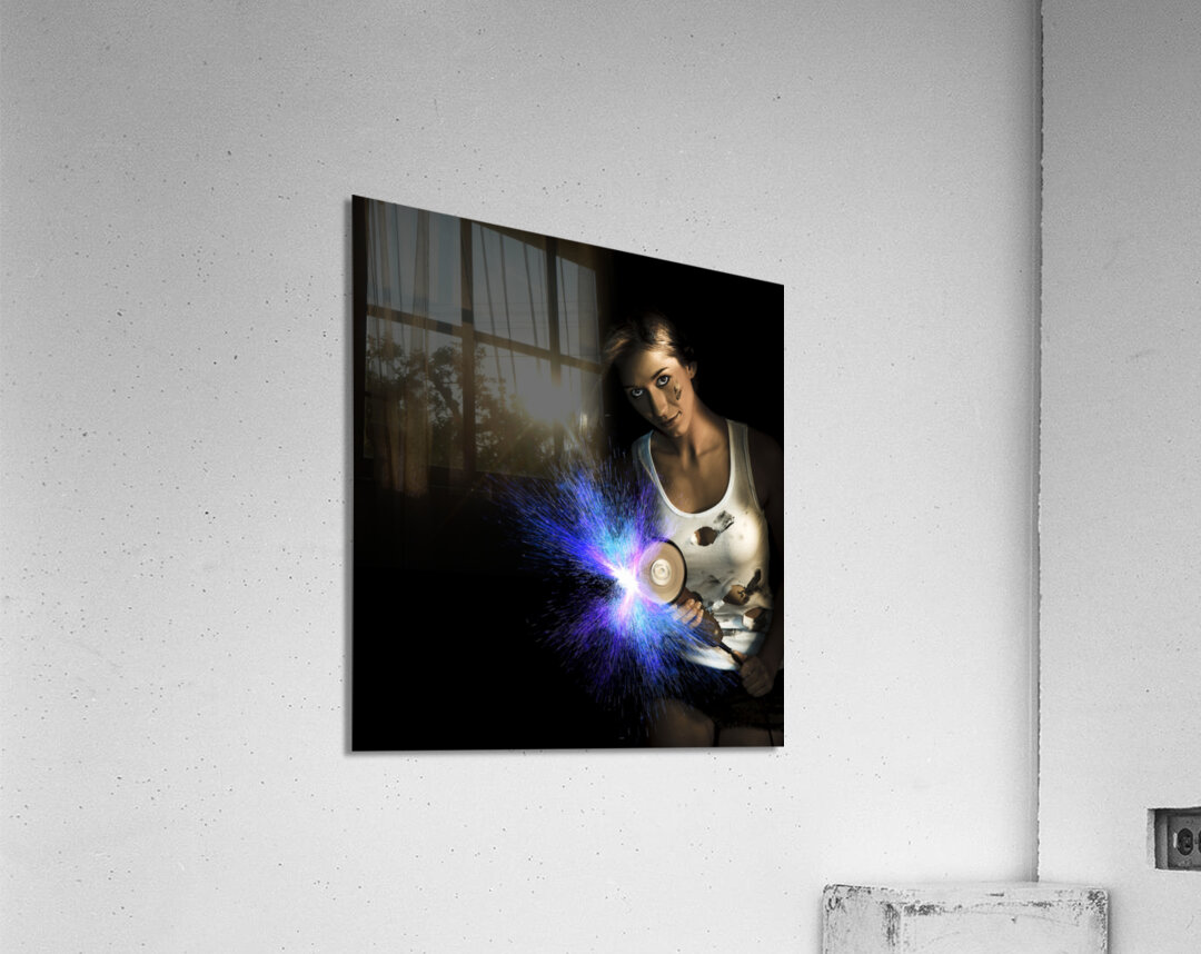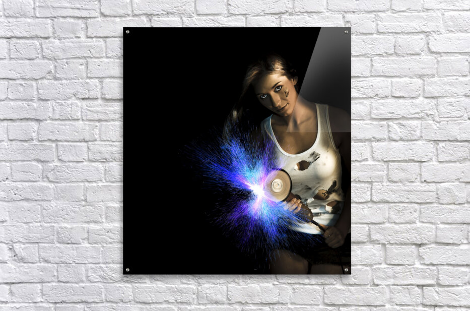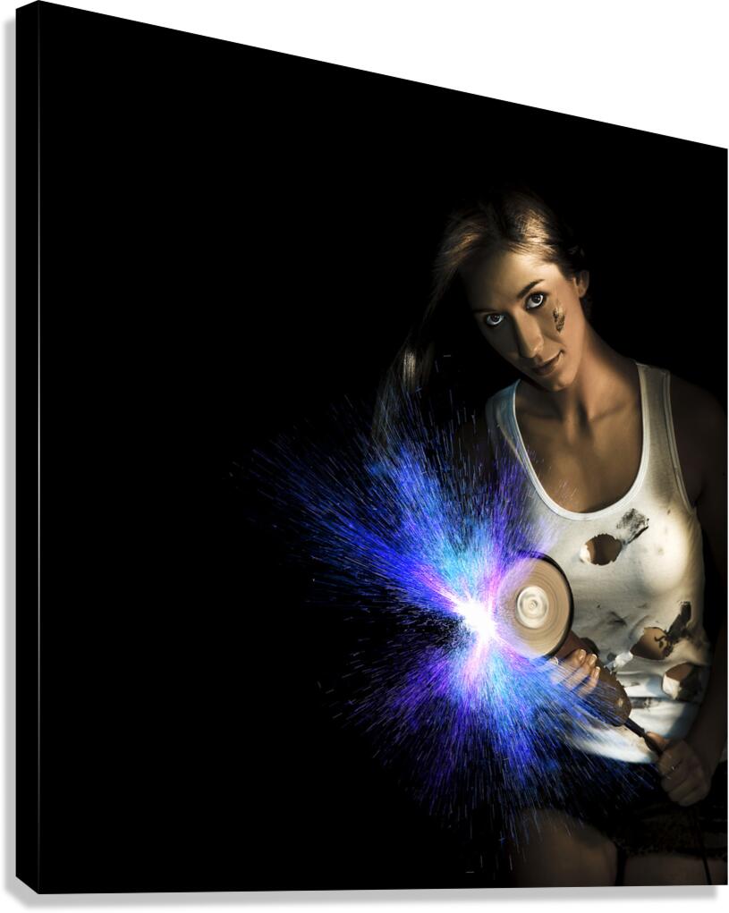Creative Dark Photograph Of A Pretty Brunette Using A Heavy Angle Grinder Tool Spraying Blue Sparks While Working In Metal Fabrication At A Steel Indu...[+]