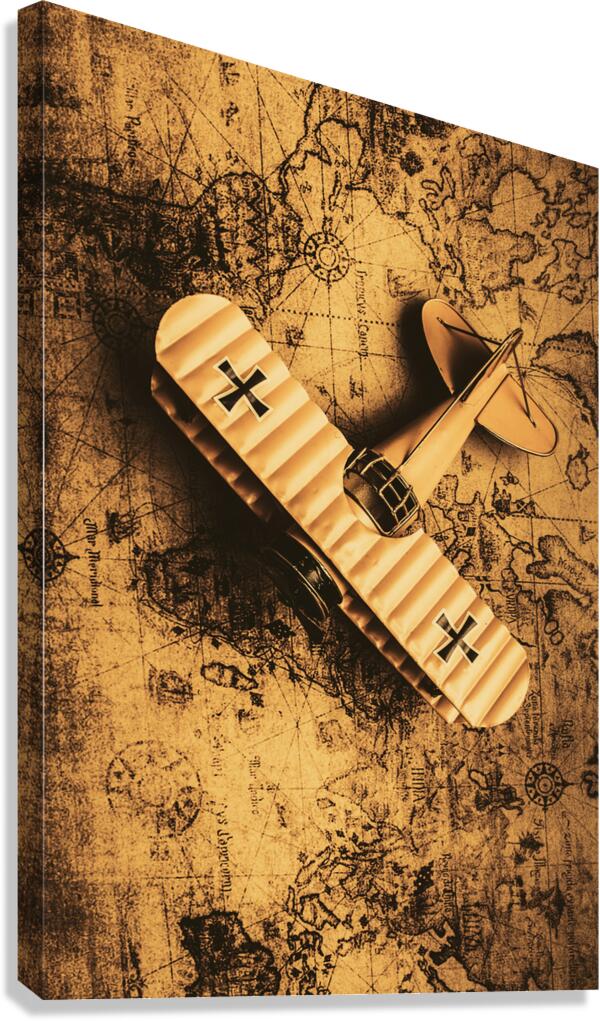 Toy biplane traversing a old world map in a still life adventure concept. Course of aviation history