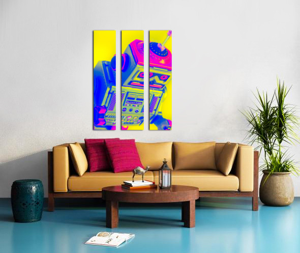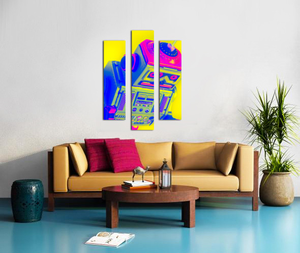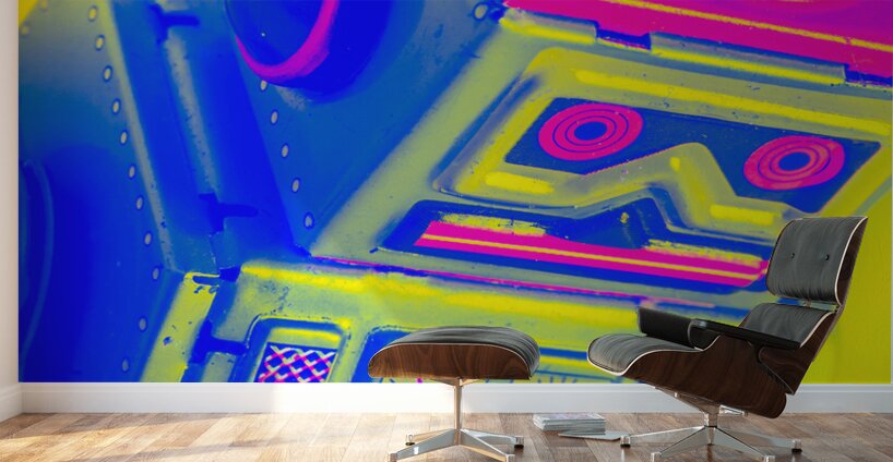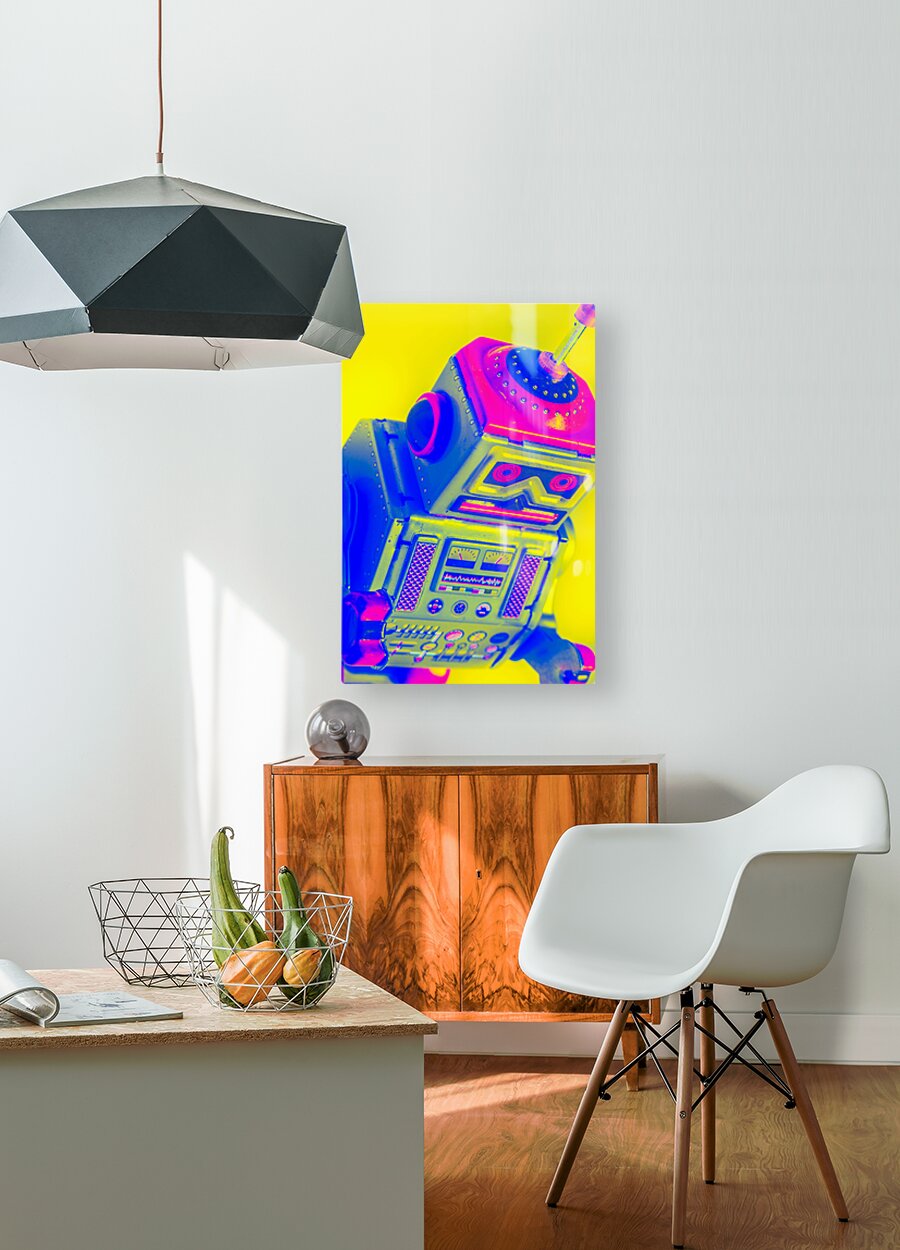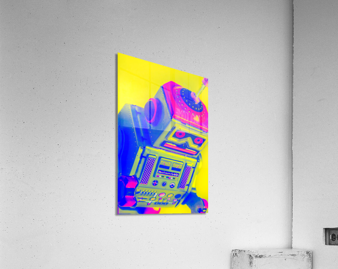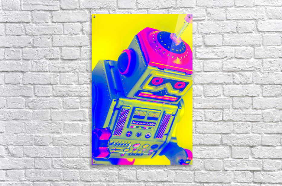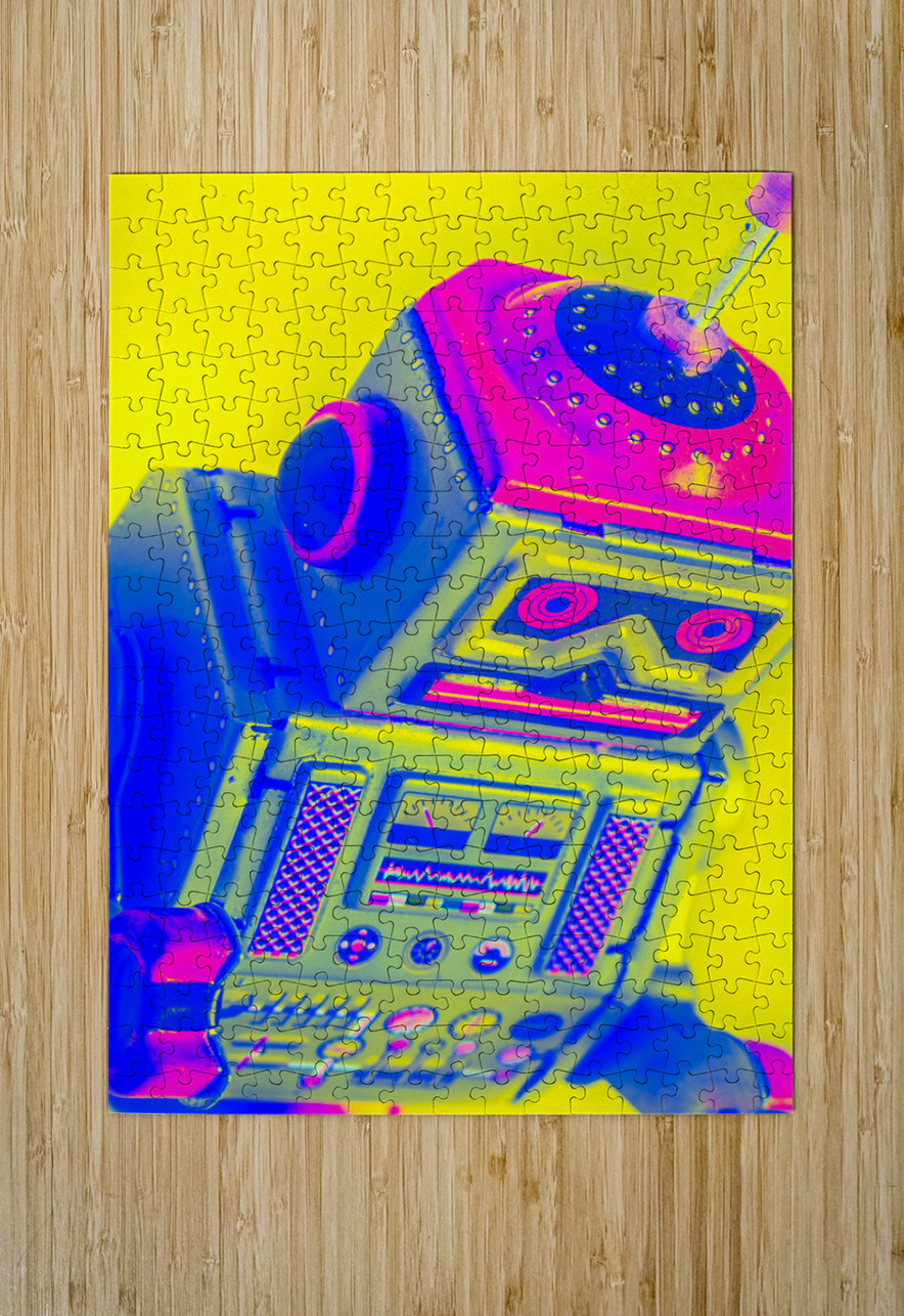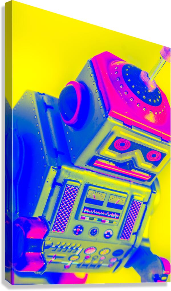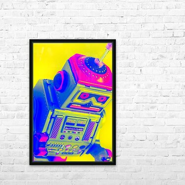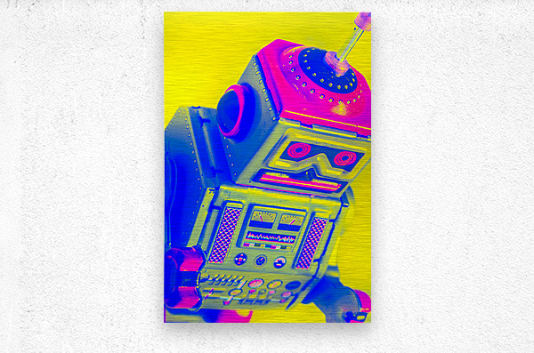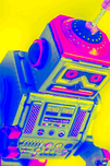 Pop-art design on a skewed robot head turn-keyed and tilt-shifted in neon dynamics