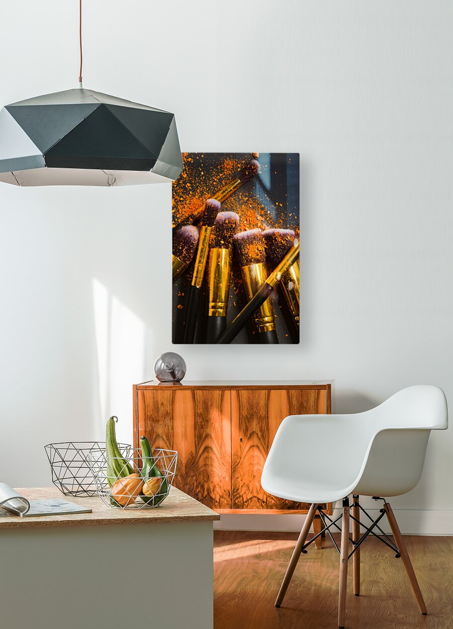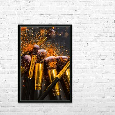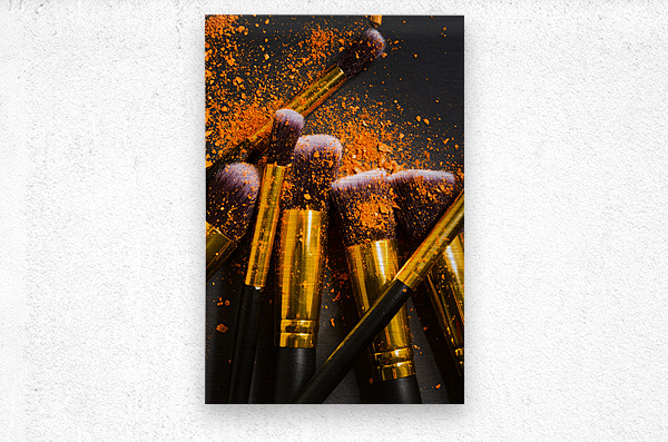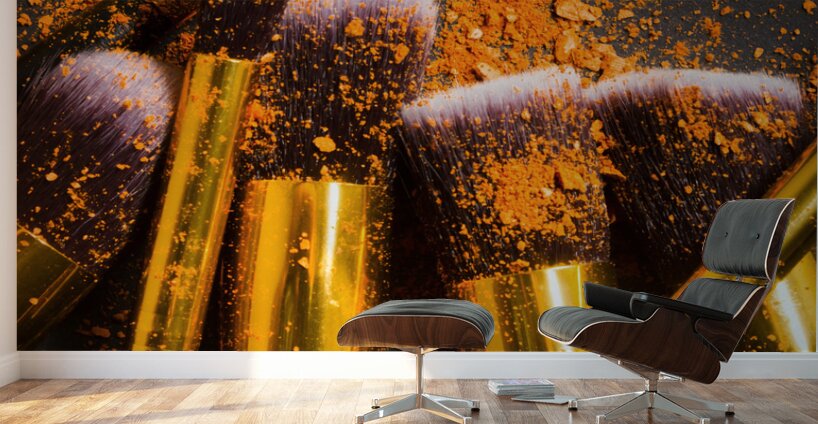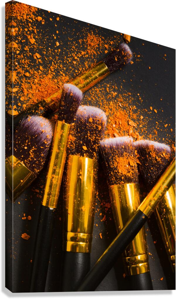 Modern make-up art on a creative explosion of black and gold glamor with foundation brushes and powder particles. Beauty Dust
