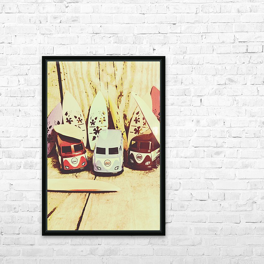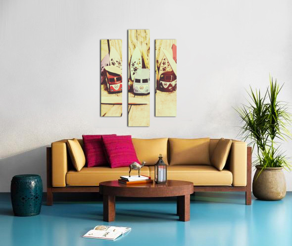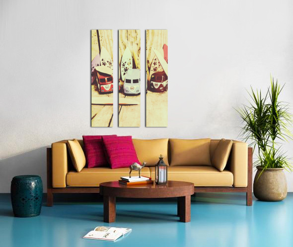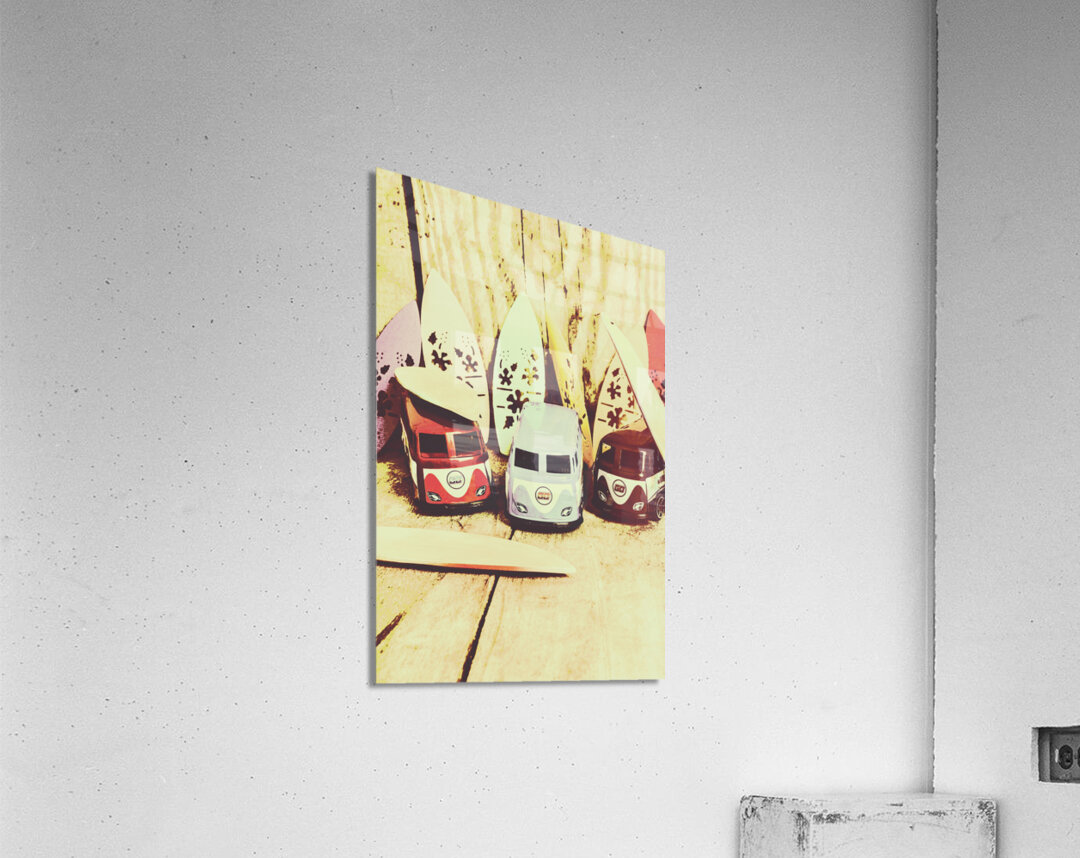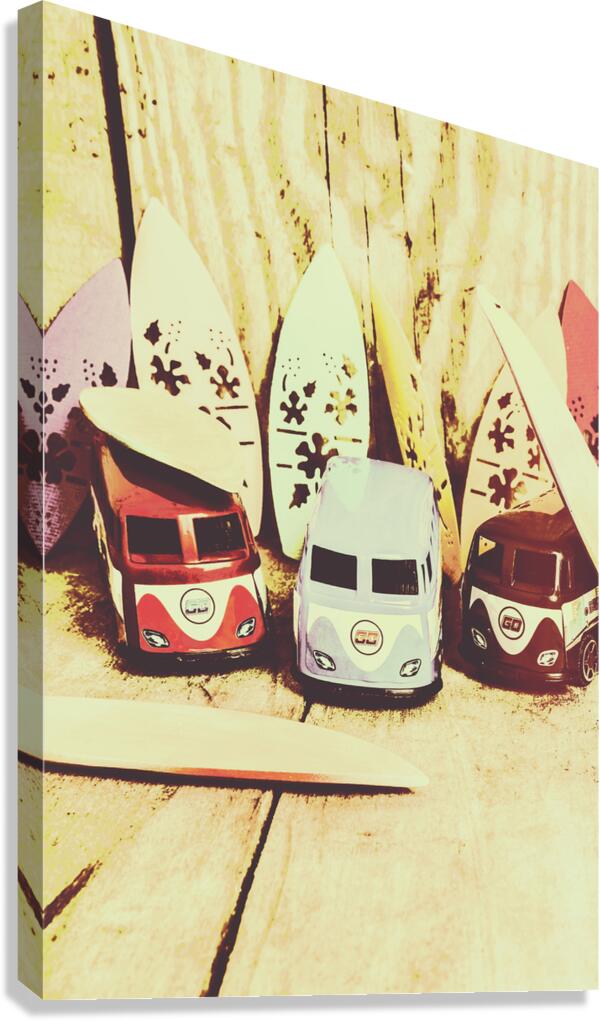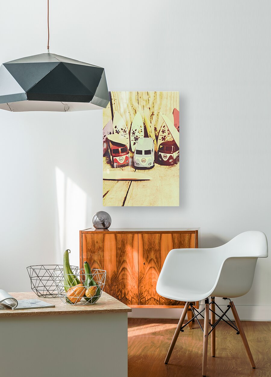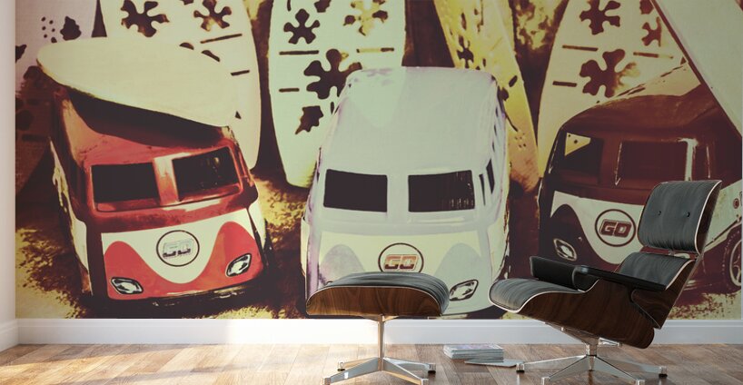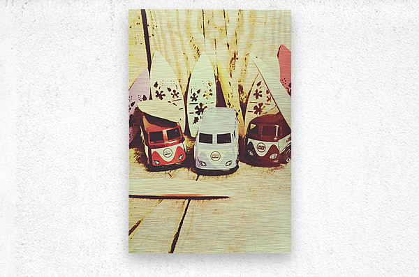 Vintage surfing art on a wooden camp of toy surf cars and decorated surfboarding icons. Sixties dreaming