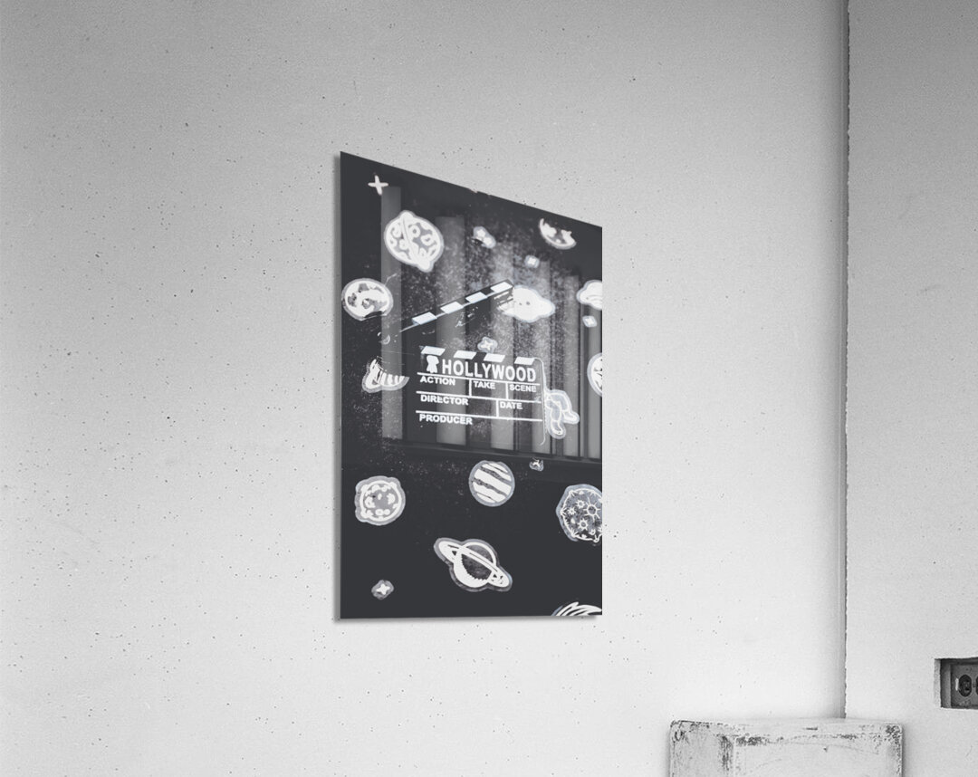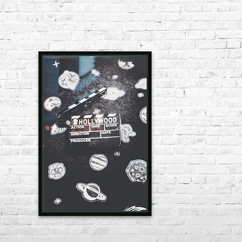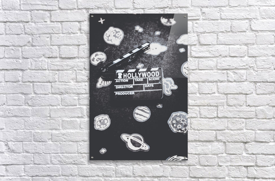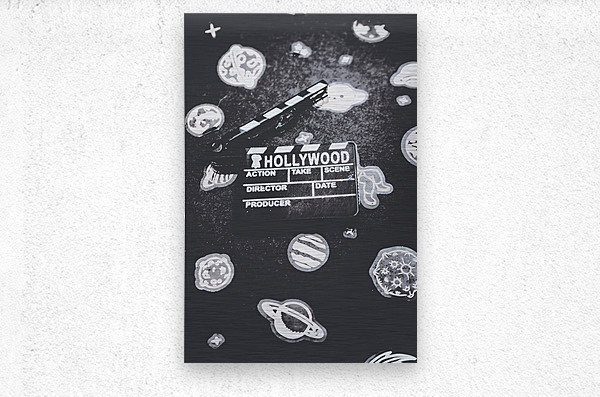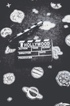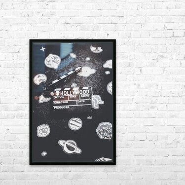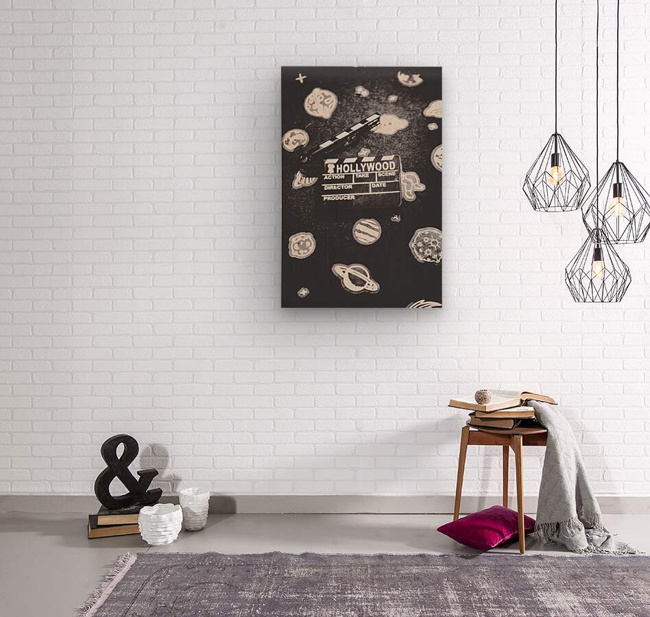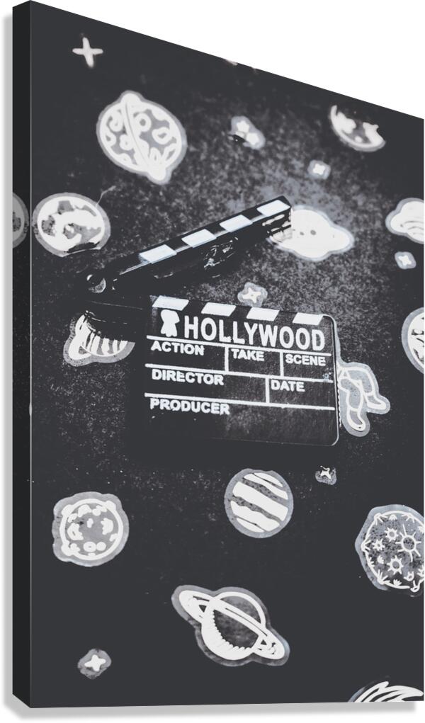 Hollywood scene in vintage cinematography with movie clapper board on a layout of galaxy icons