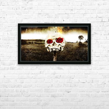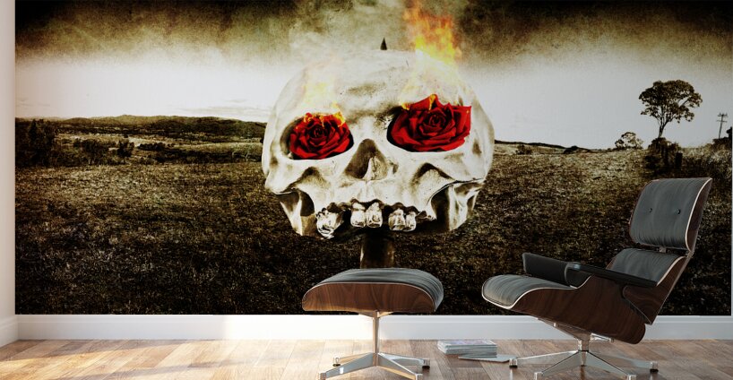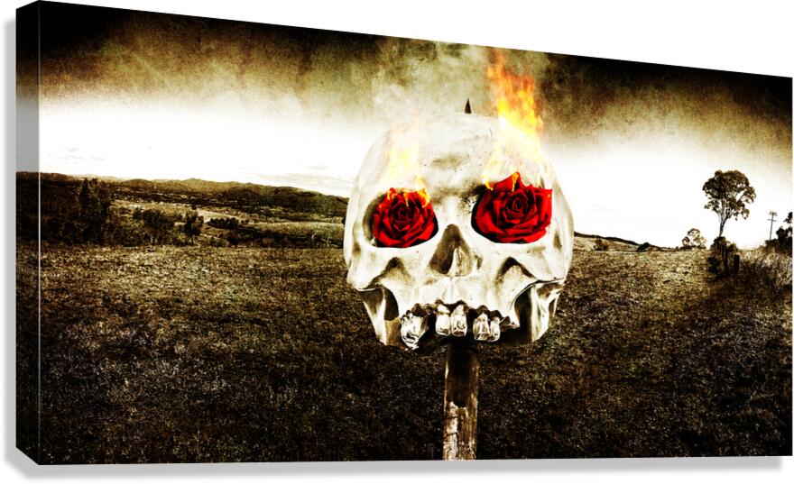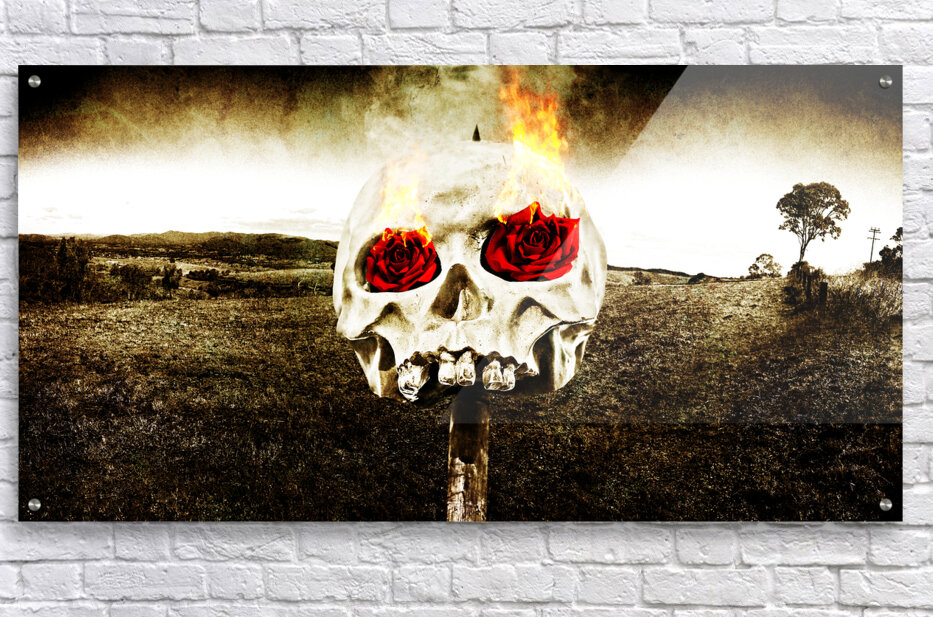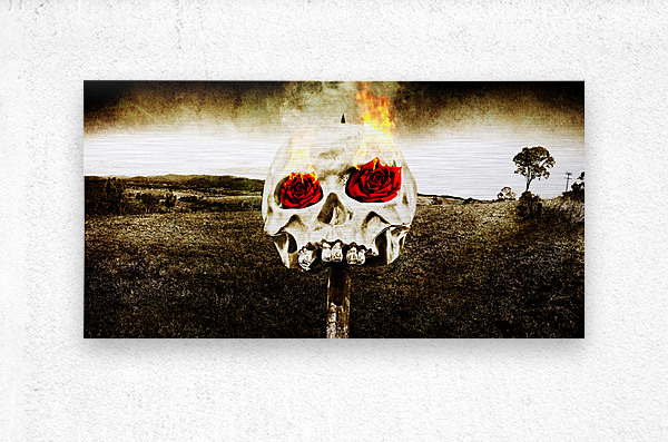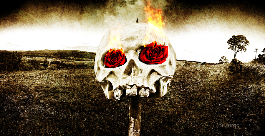 Dark Morbid Photo Of A Skull On A Wooden Stake With Burning Rose Eyes On A Gloomy Landscape Background