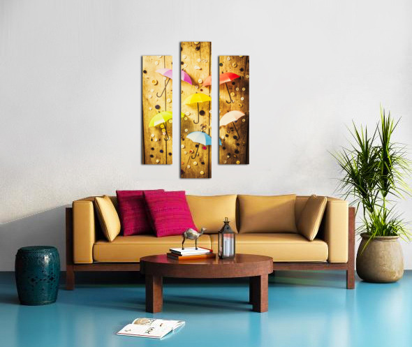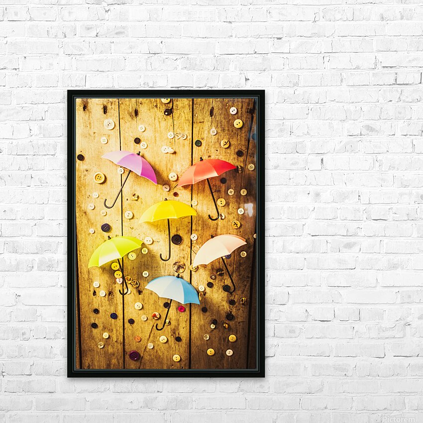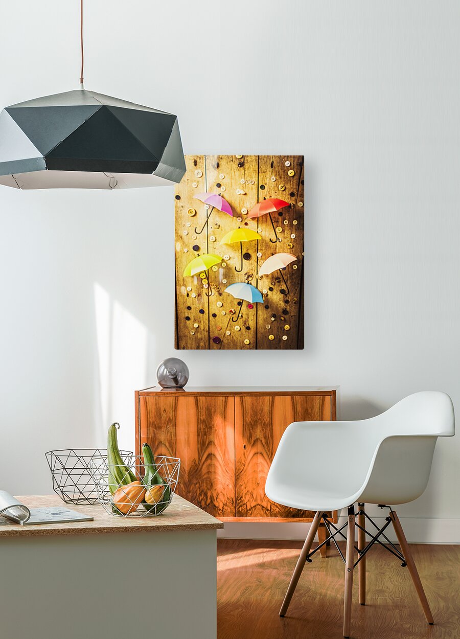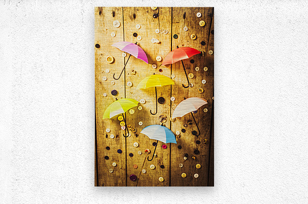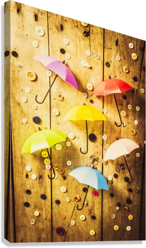 Quirky still life scene of umbrellas under storms of button rain. In rainy fashion
