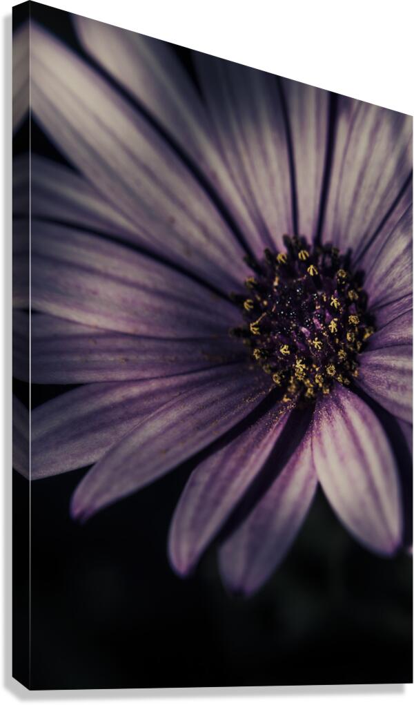 Dark nature photo of a a violet osteosperumum flower known as a purple daisy. Floral details taken Swansea Tasmania