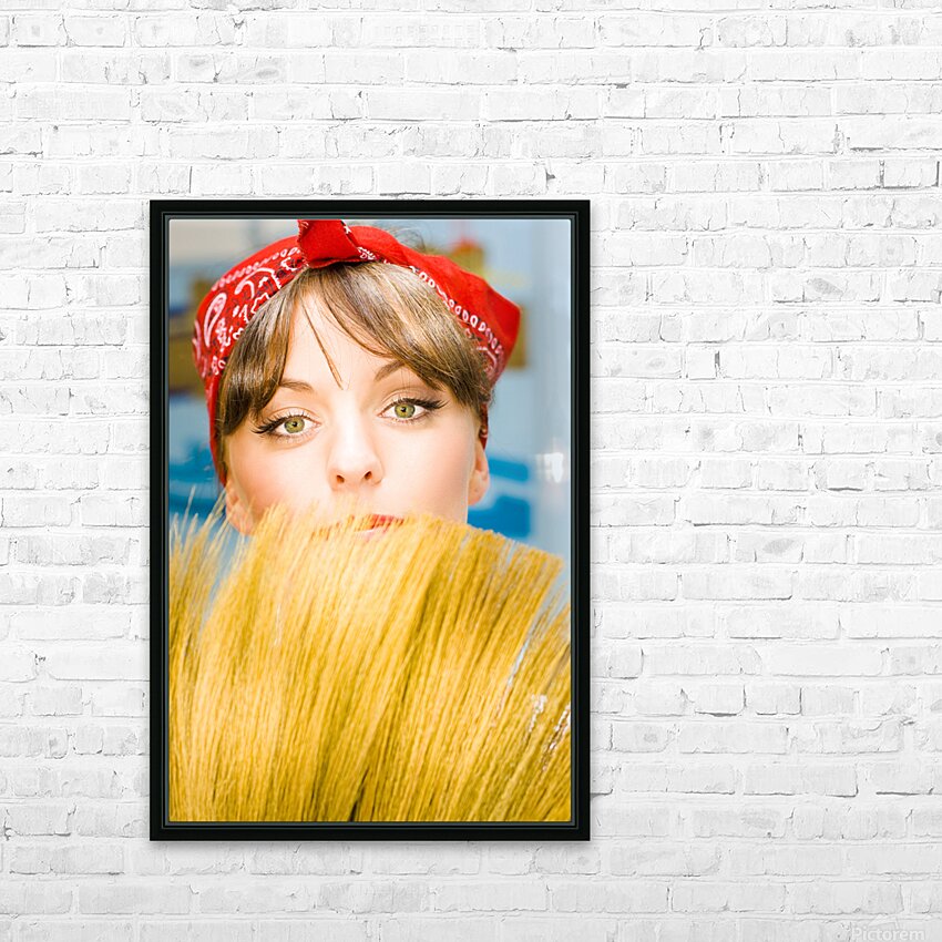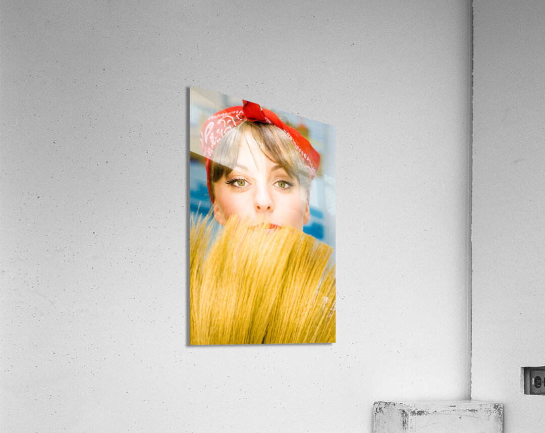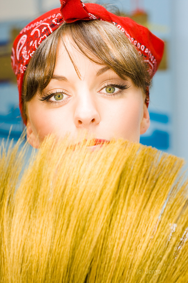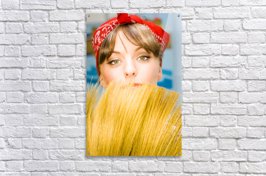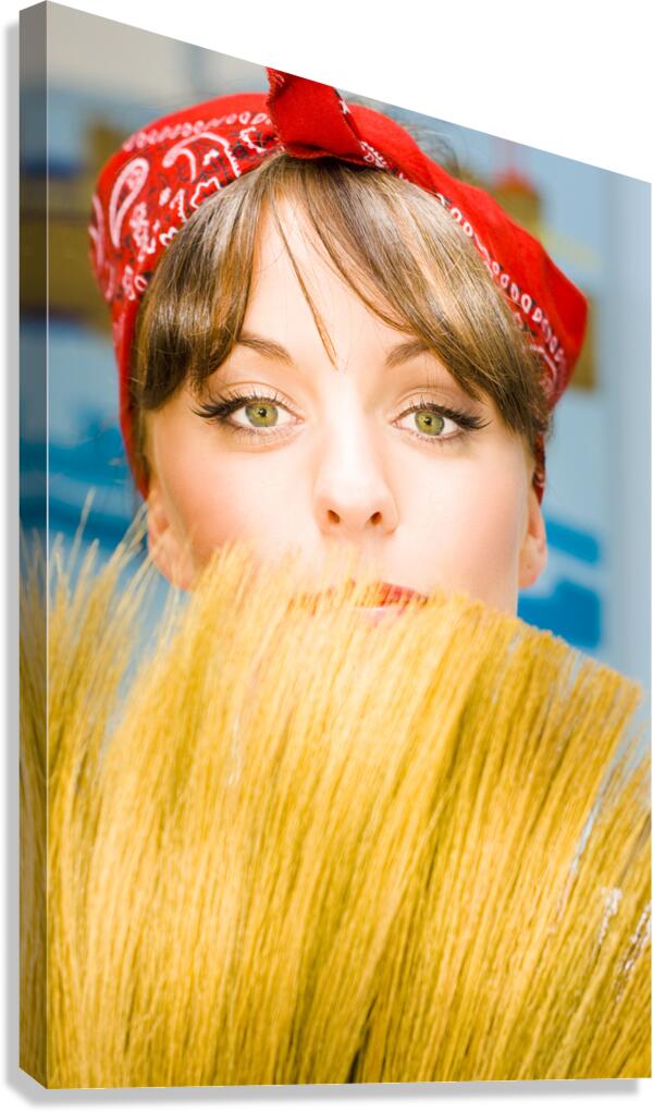 Cute Household Cleaning Maid Woman Wearing Red Head Scarf Holding Up A Broom Ready To Sweep In A Domestic Cleaning Maid Housekeeping Concept