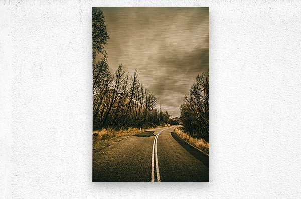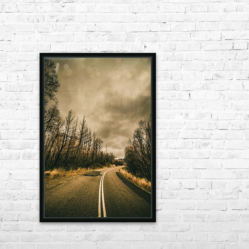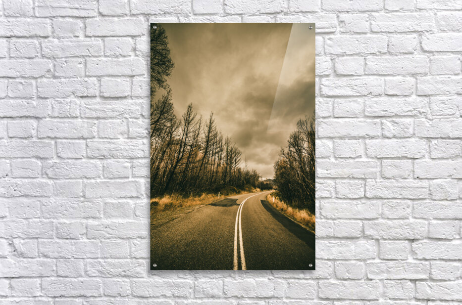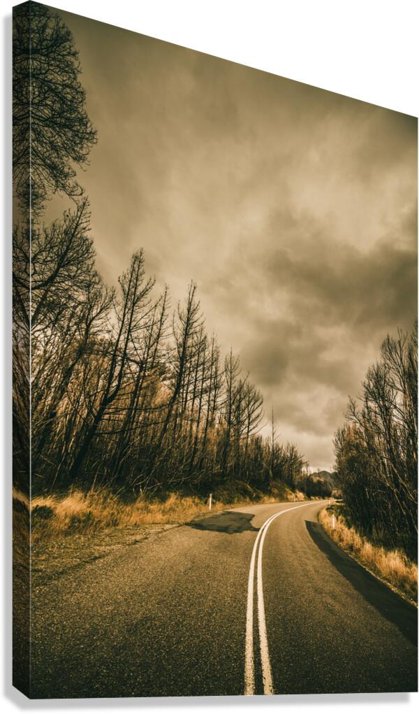 Creepy overcast highway leading through ash burnt forestry with leafless branches and torrential skies. Lyell Hwy A10 Gormanston Tasmania Australia