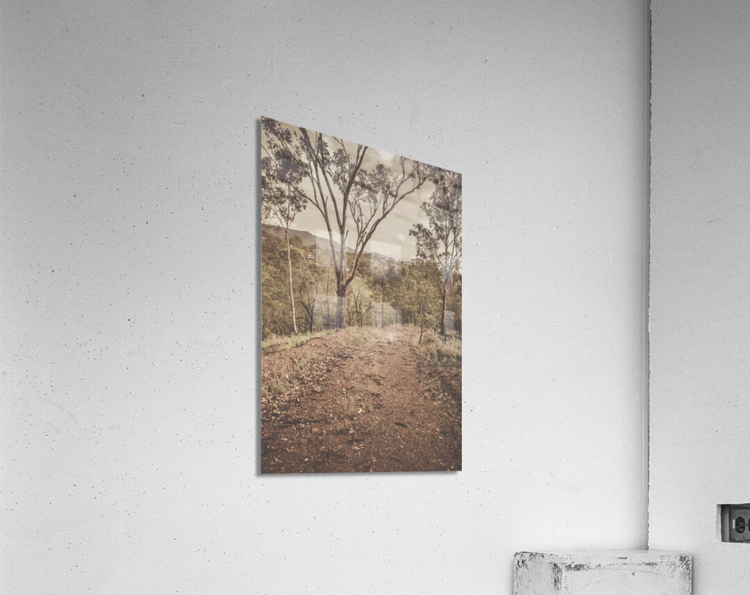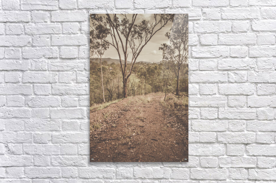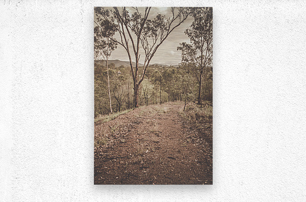 Tranquil hilltop road traversing rustic mountain wilderness in subdued tones. Mount Perry Queensland Australia