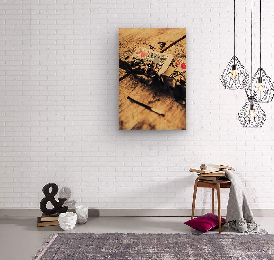 Still-life artwork on a burnt pair of playing cards from a burnt winning streak. Royal flush