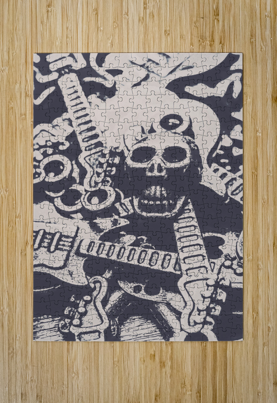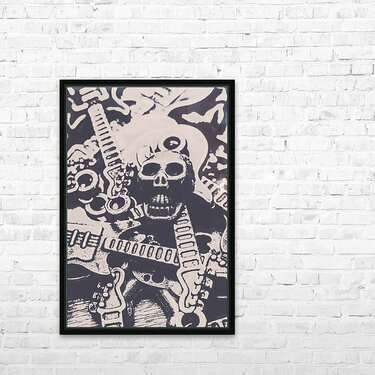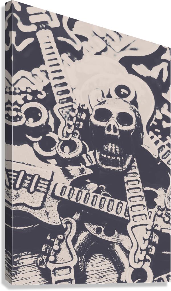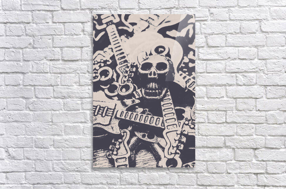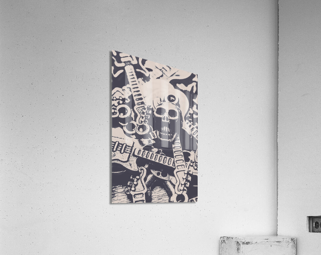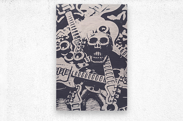 Cold toned artwork on symbols of rocker rebellion visualised with skulls and crossed guitars. Kill the f$%#n music industry