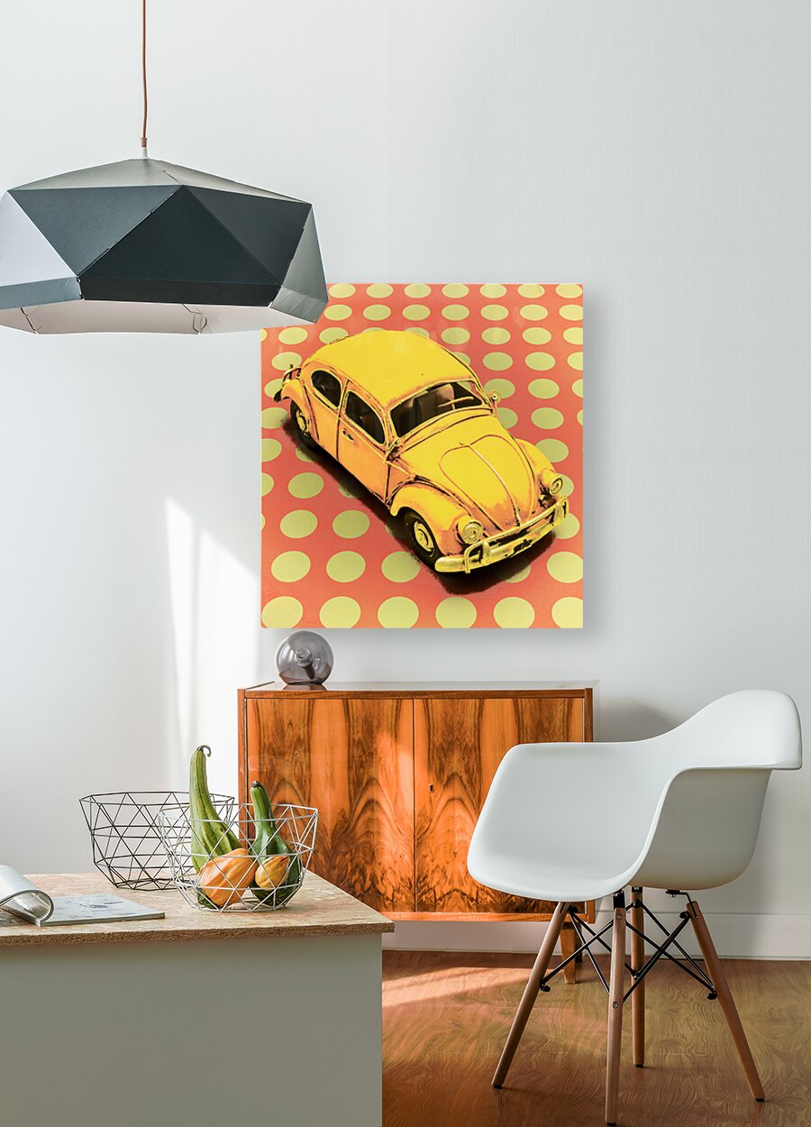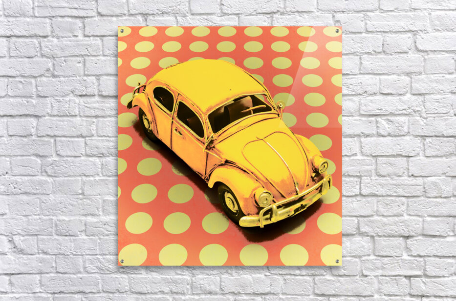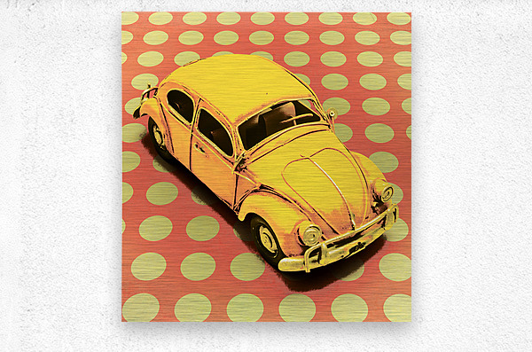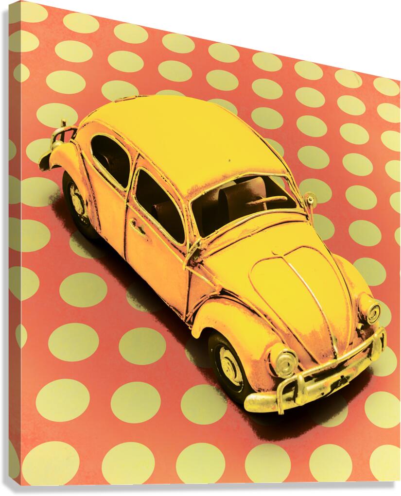 Retro polka-dot design on a revival of motorized history with toy VW Beetle in comic style. Car Toon