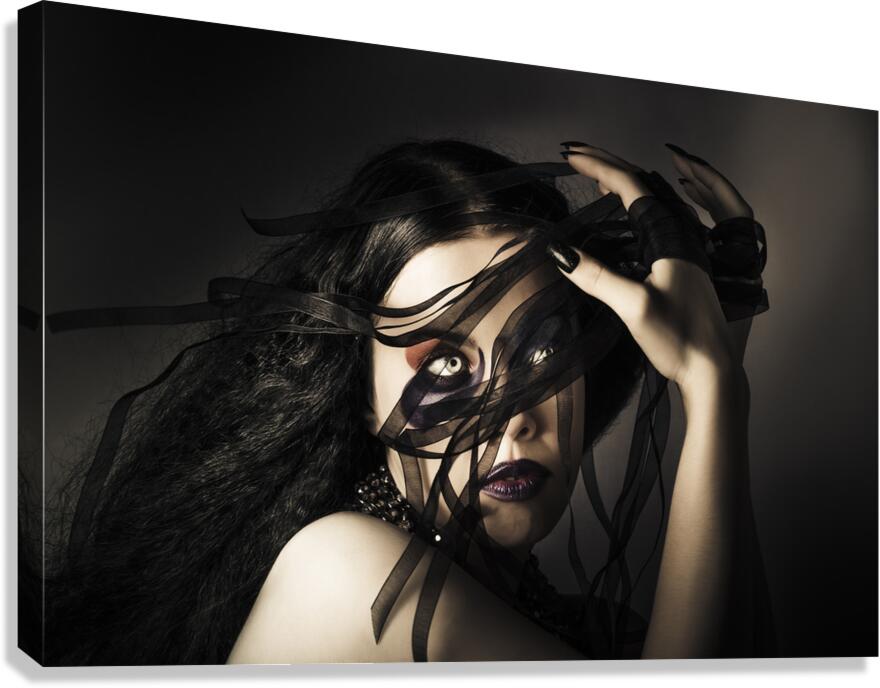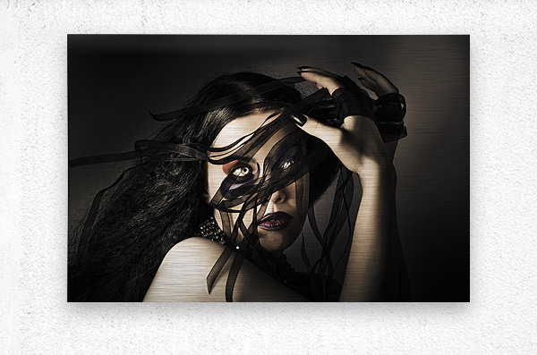 Elegant female beauty standing in the darkness holding lace fabric textiles in hand when designing fine art fashion clothing in avant-garde style. fashion queen concept