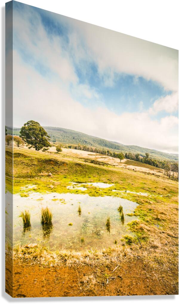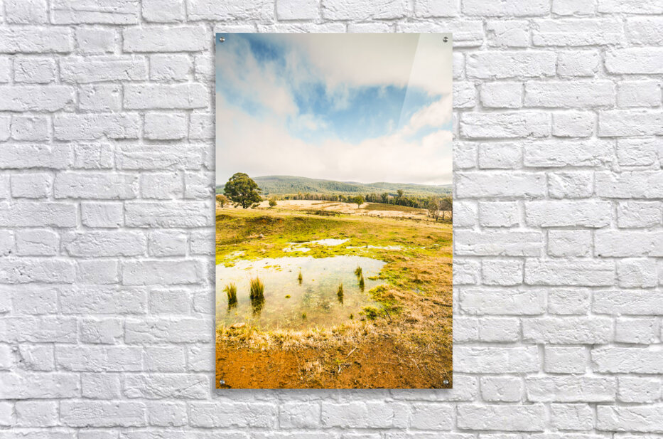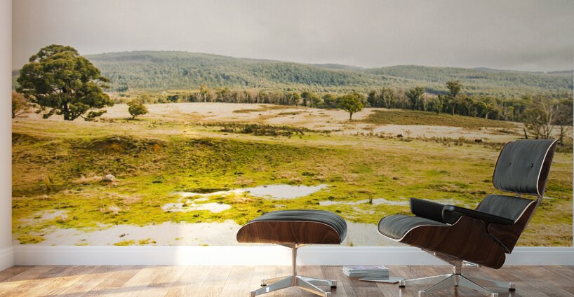 Gorgeous pastel toned landscape scene encompassing puddled fields and distant hills. Ellendale Tasmania Australia