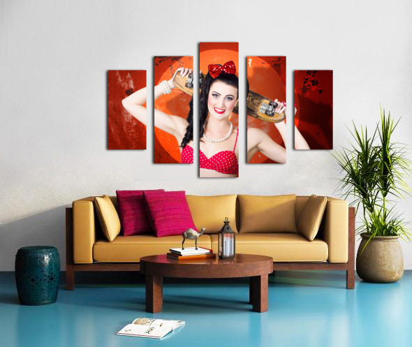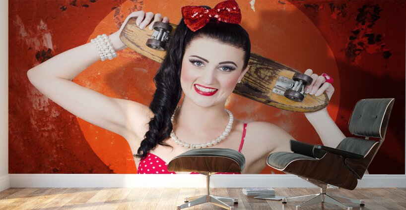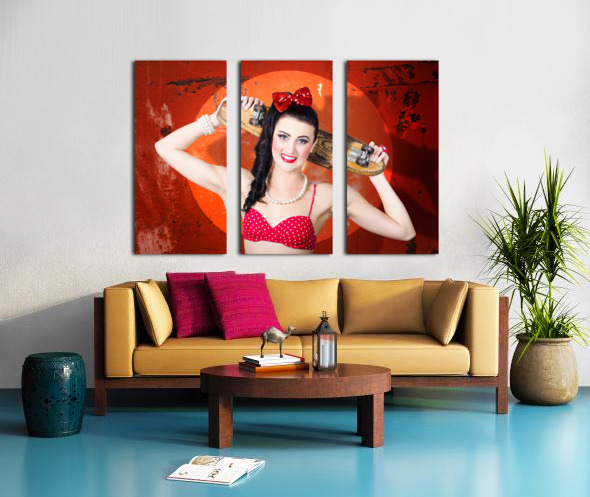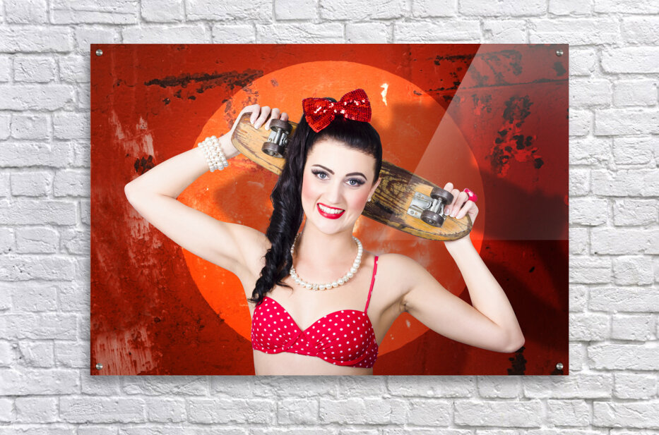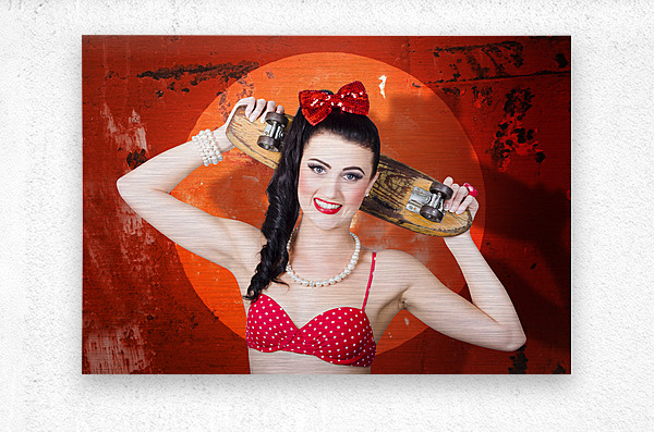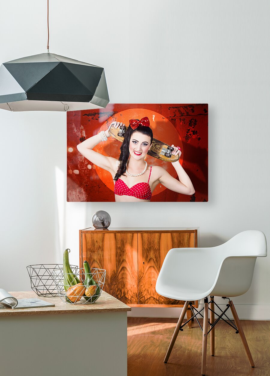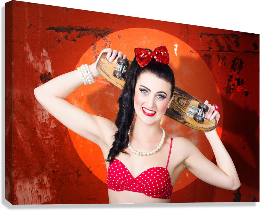 ABOUT THIS ARTWORK: RETRO PINUP GIRL HOLDING OLD WOODEN SKATEBOARD