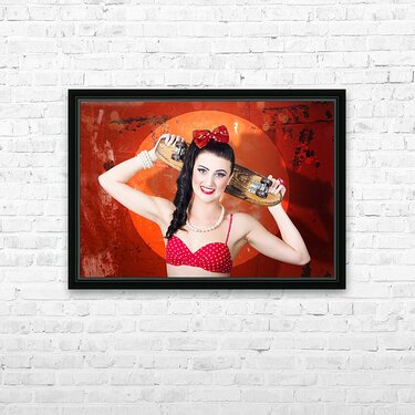 Retro pinup girl holding old wooden skateboard Picture Frame Printing