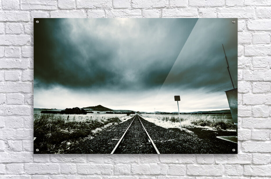 Dense overcast conditions lay abound a winter railway line with straight line track passing through snow background. Taken York Plains Tasmania Australia