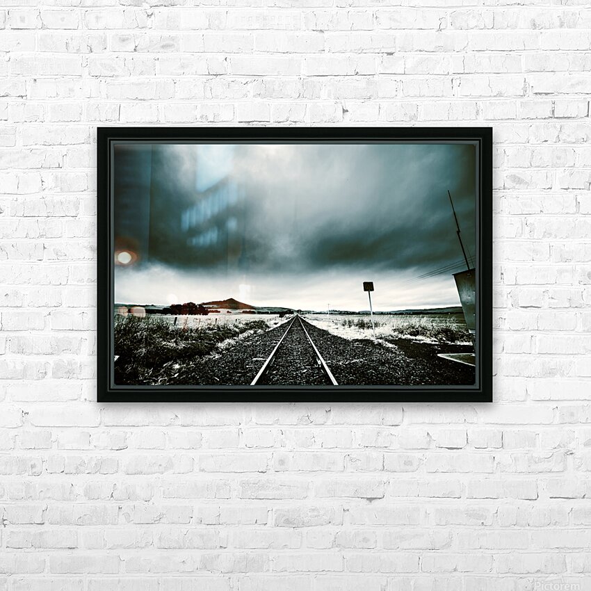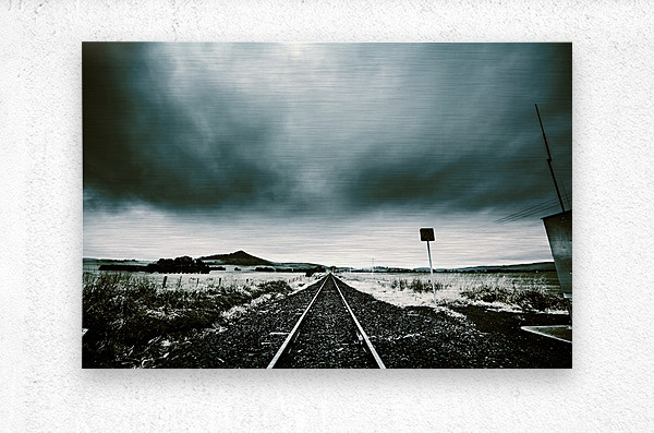 Dense overcast conditions lay abound a winter railway line with straight line track passing through snow background. Taken York Plains Tasmania Austra...[+]