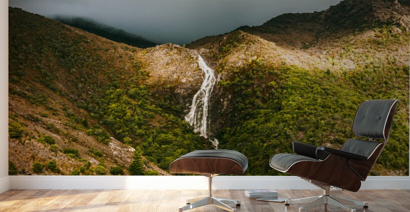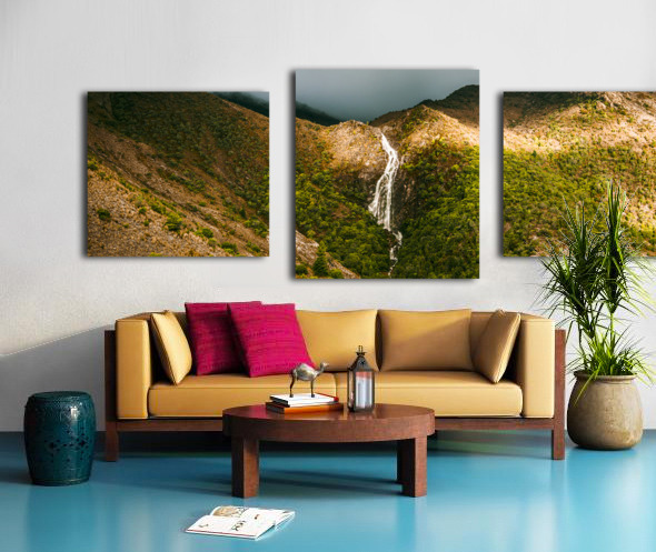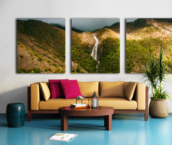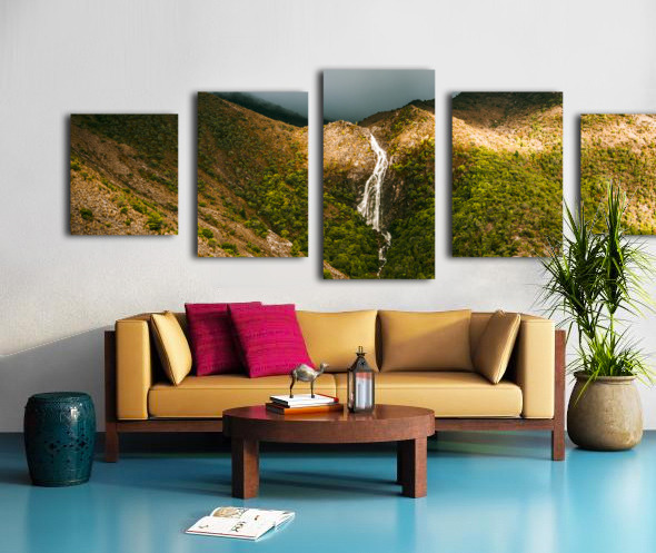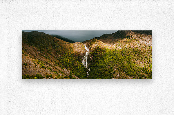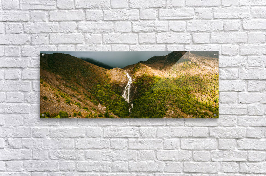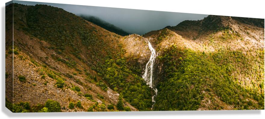 Fine artwork landscape of a flowing Australian waterfall filling the lush green valleys below. Horsetail falls in Queenstown Tasmania