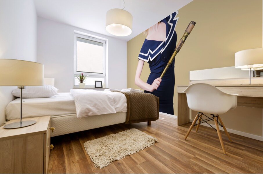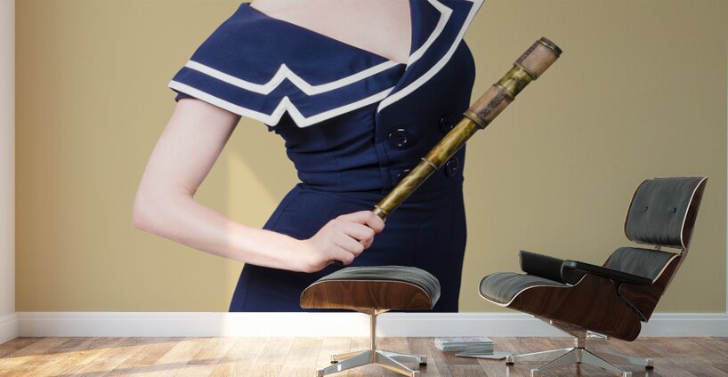Sailor girl pin-up looking out to sea with vintage telescope. Maritime navigation concept