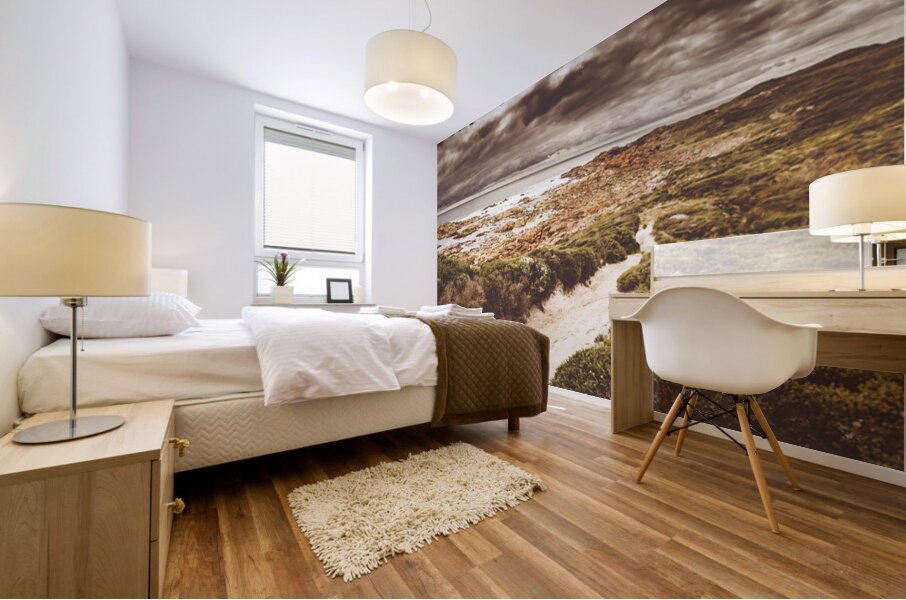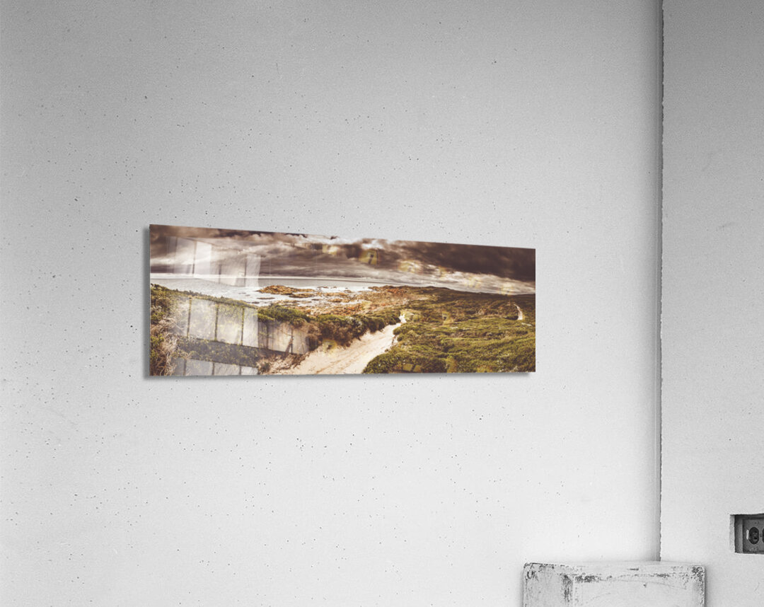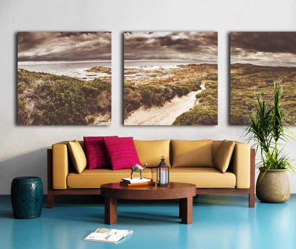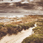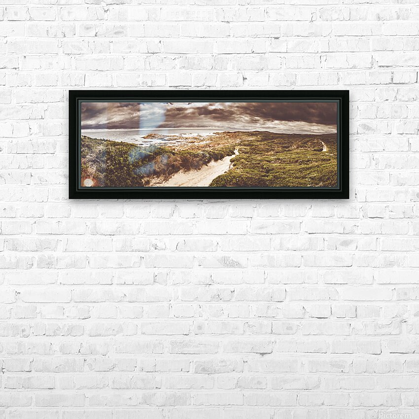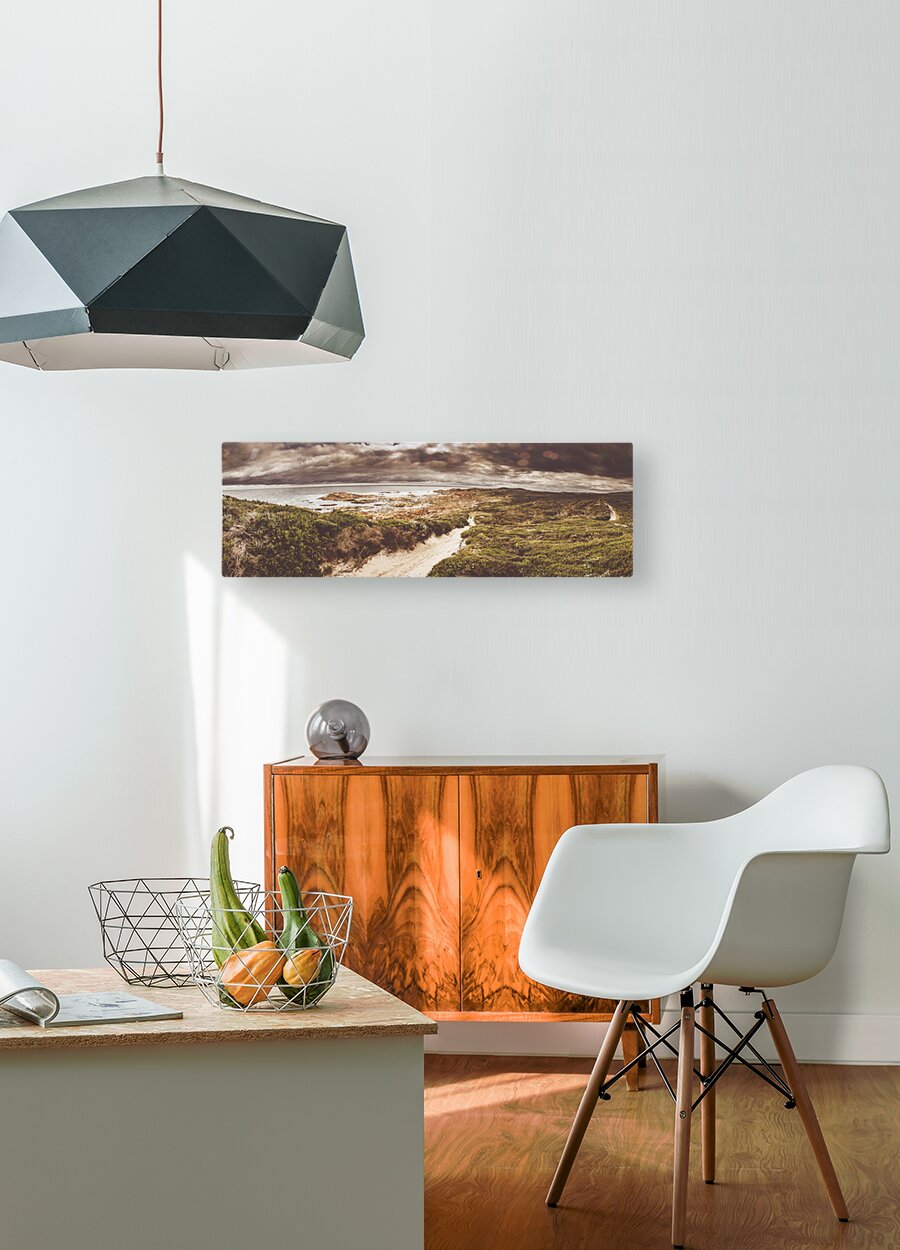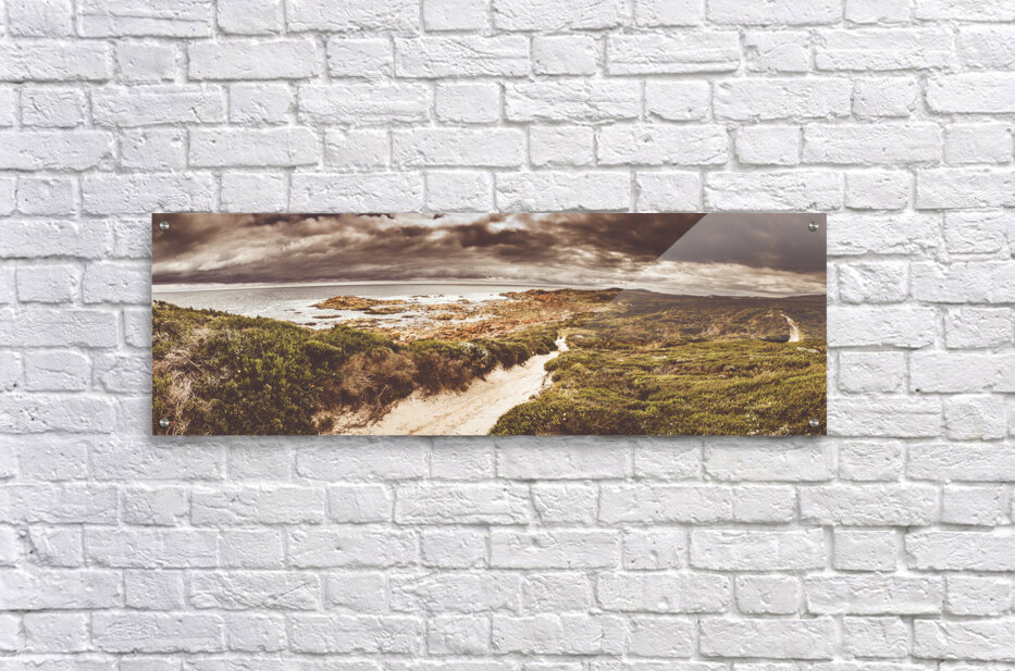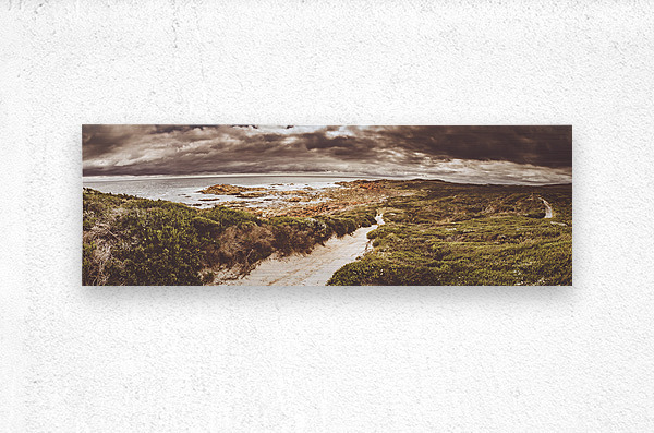 Panorama fine art landscape on a sand covered trail leading beside a prospective stormy western coast sea. Taken Granville Harbour Tasmania Australia