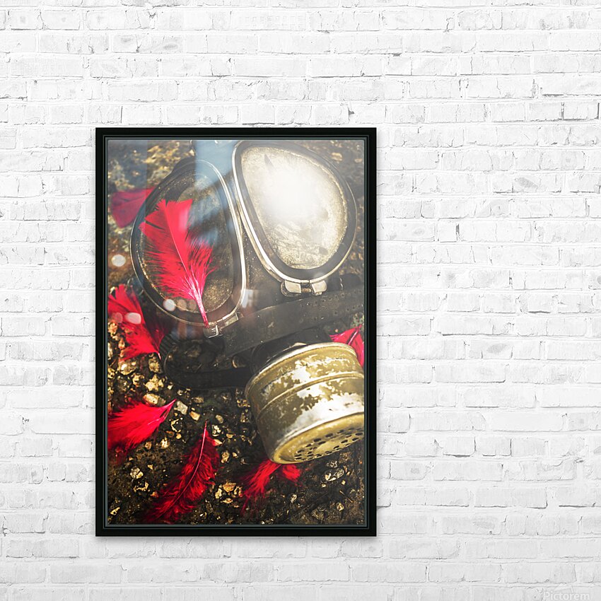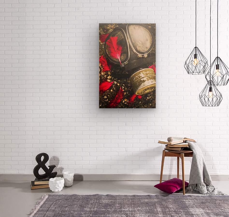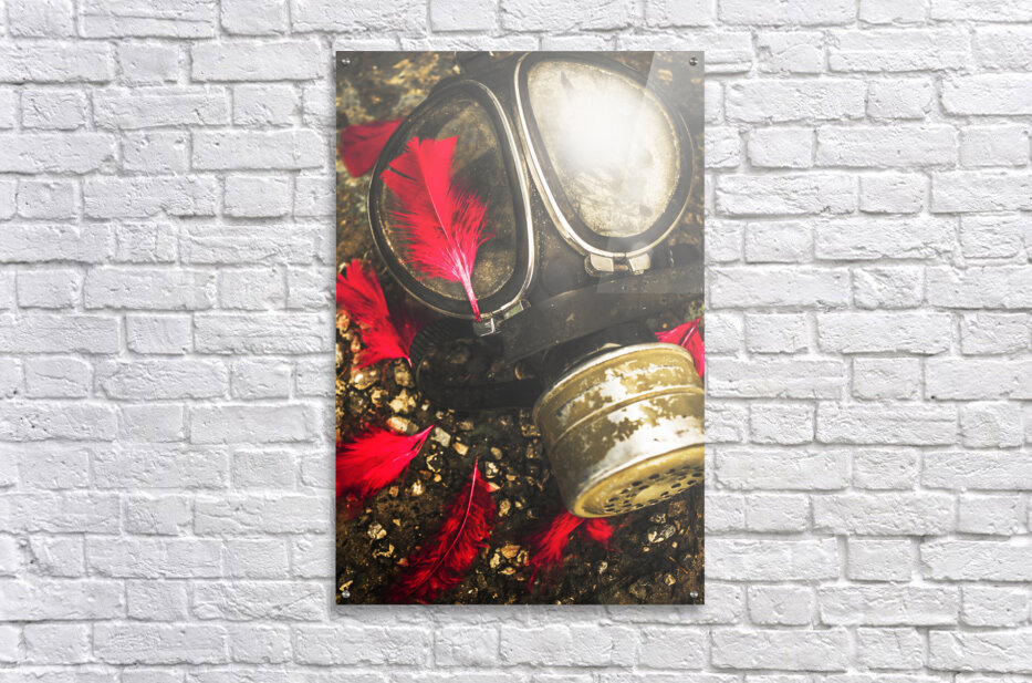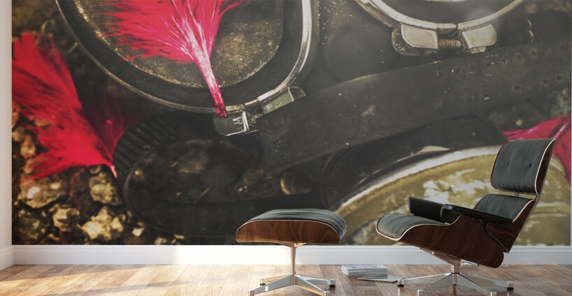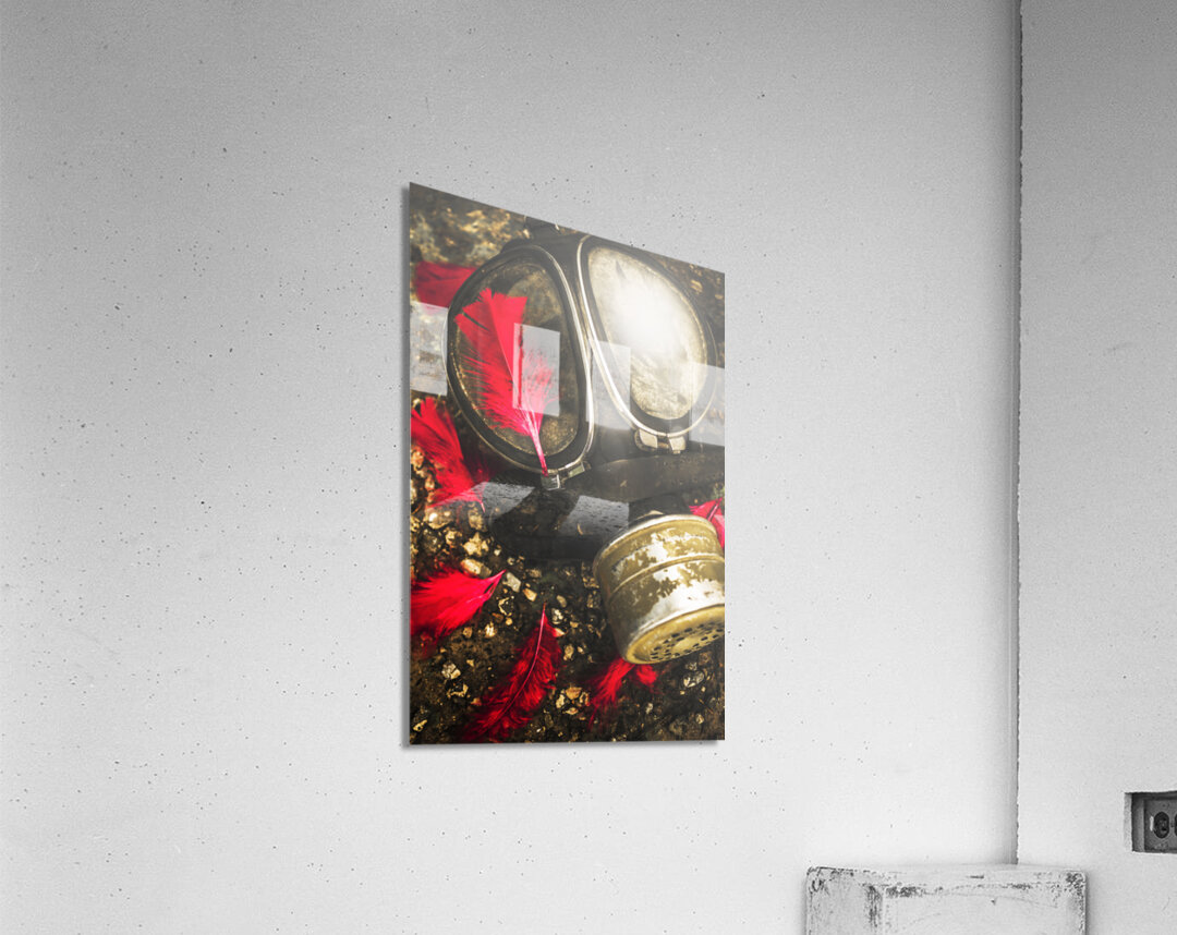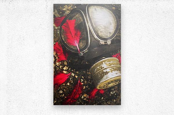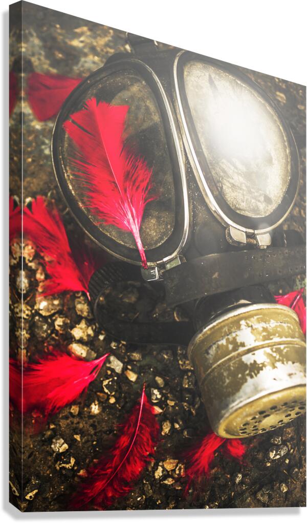 Close up on an old chemical gas mask with shrowdes of fallen red feathers. Soldiers of the fallen