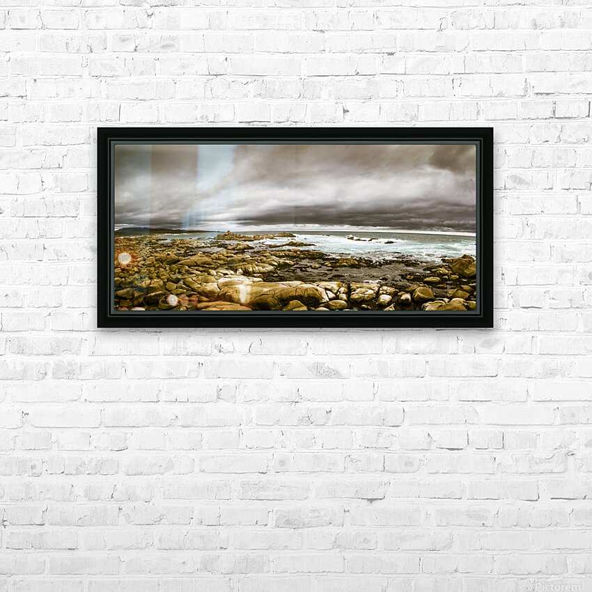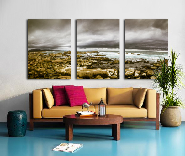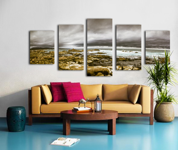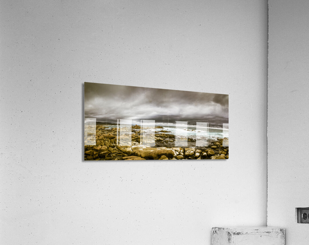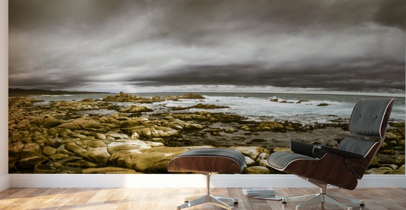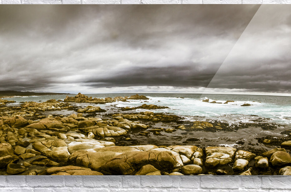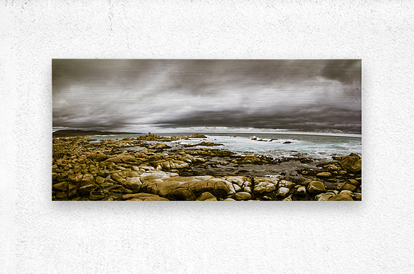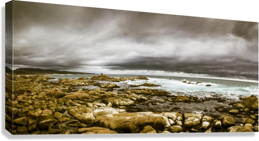 Atmosphere in a oncoming storm with a wide angle landscape capturing the dramatic hues on a cloudy Tasmanian rocky coast. Taken Granville Harbour Australia