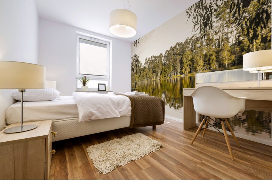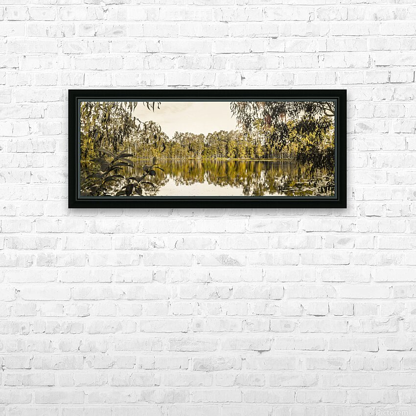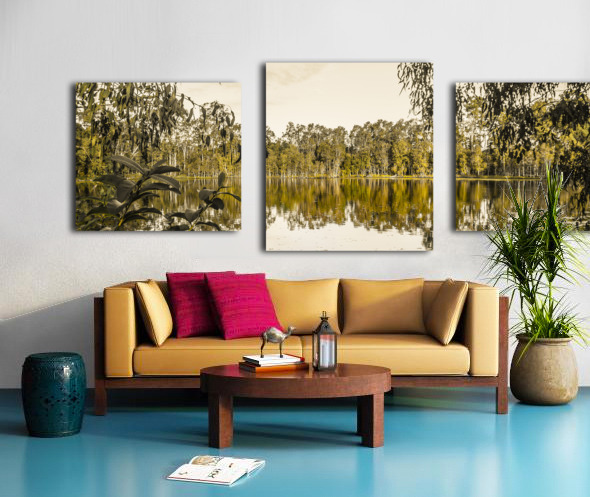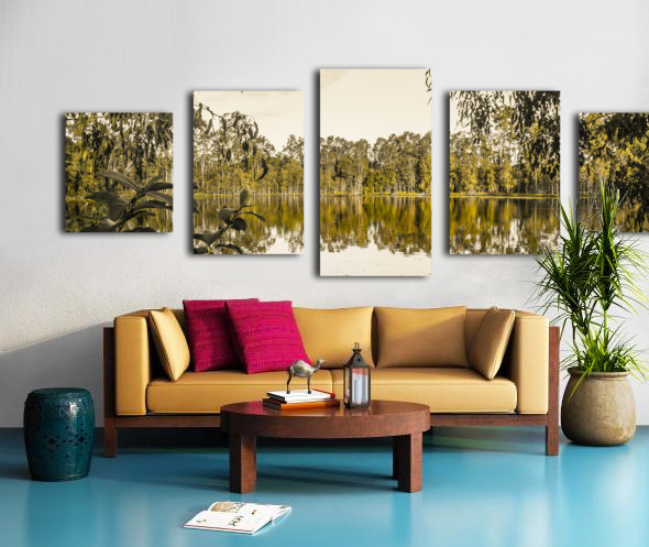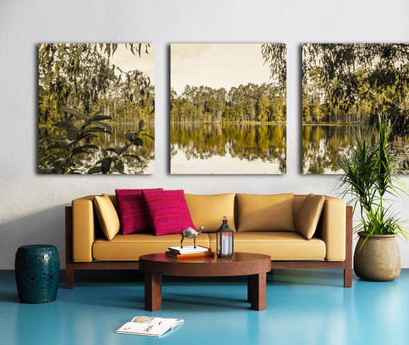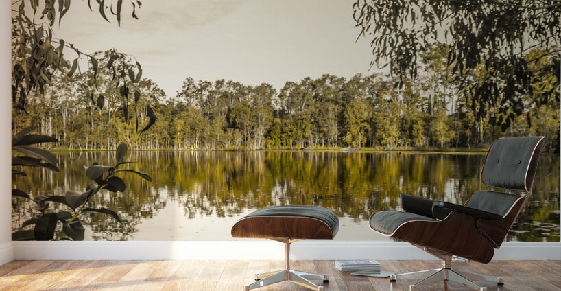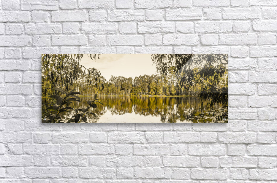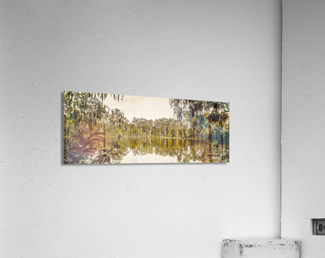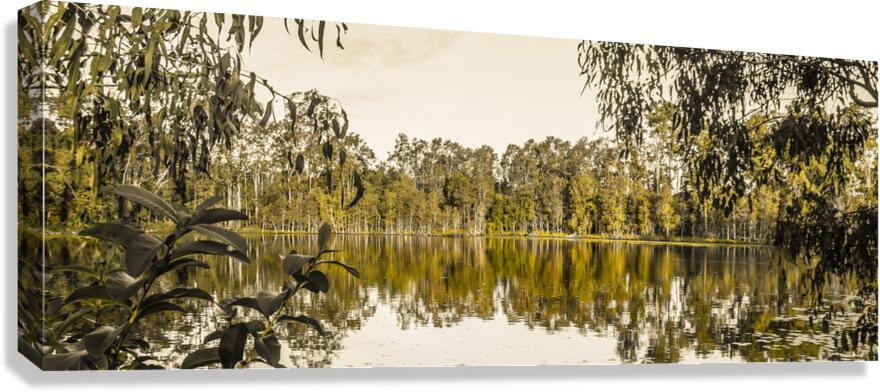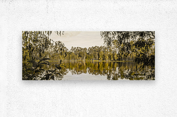 Panoramic landscape art on a wide vista of mirror trees against still waters. Taken: Murrumba Downs Queensland Australia